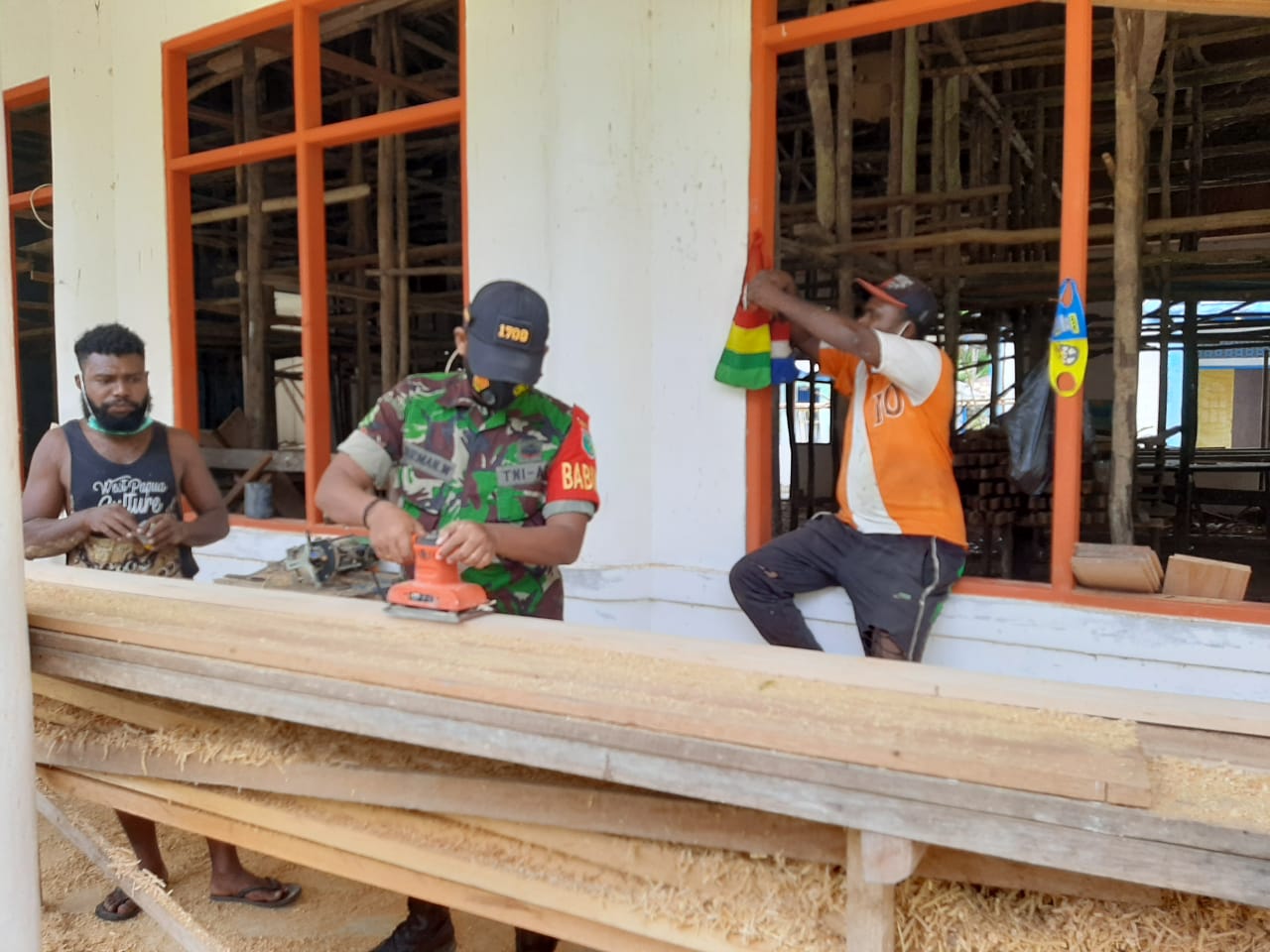 KeizalinNews.com Supiori — guna terciptanya Kerjasama yang baik bersama Rakyat, Babinsa Koramil 1708-04/Supiori Selatan Kopda Sudirman Wakimin melaksanakan Karya Bakti dalam hal ini membantu Skap Kayu dalam Rangka Pembangunan Gereja bertempat di Desa Odori Distrik Supiori Selatan Kab. Supiori, Selasa (22/02/2022).