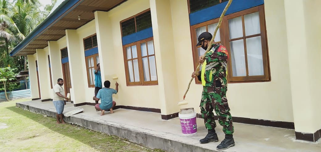 KeizalinNews.com Numfor — Bintara Pembina Desa (Babinsa) harus selalu berada di tengah aparat Pemerintah dan masyarakat yang menjadi tugas binaannya. Seperti yang dilakukan Serda Silvester Noo Babinsa 1708-05/Numfor membantu pengecetan Gereja Bhetel Yemburwo di kampung Yemburwo Distrik Numfor Timur, Senin (28/02/2022).