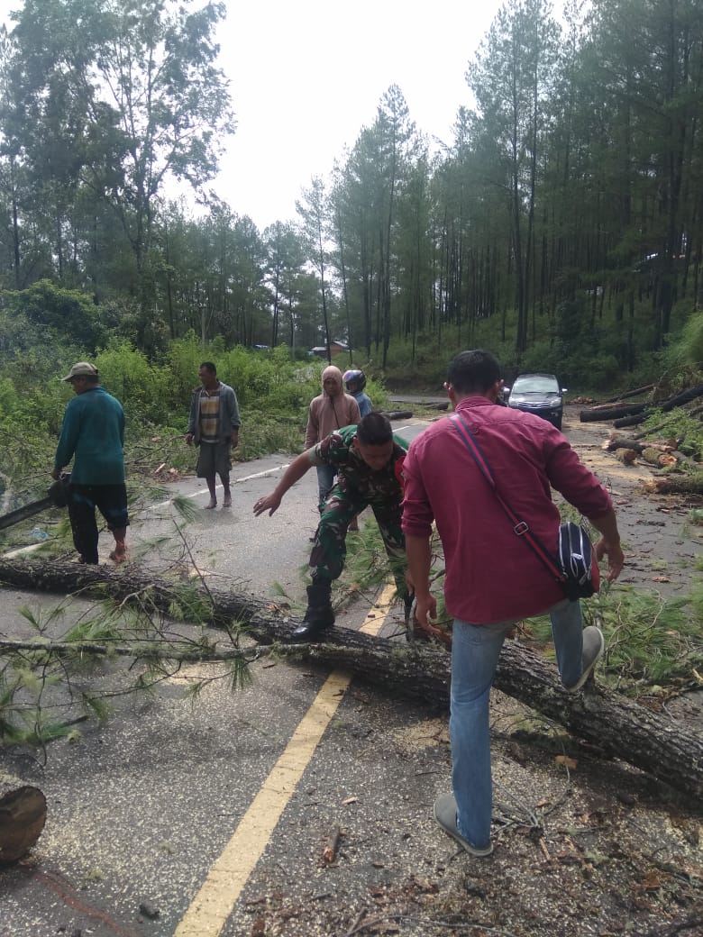 Mendengar informasi pohon tumbang menutup jalan, Serda P Sinurat langsung menuju lokasi serta mengajak warga setempat bergotong royong membersihkan pohon agar bisa dilalui jalan tersebut