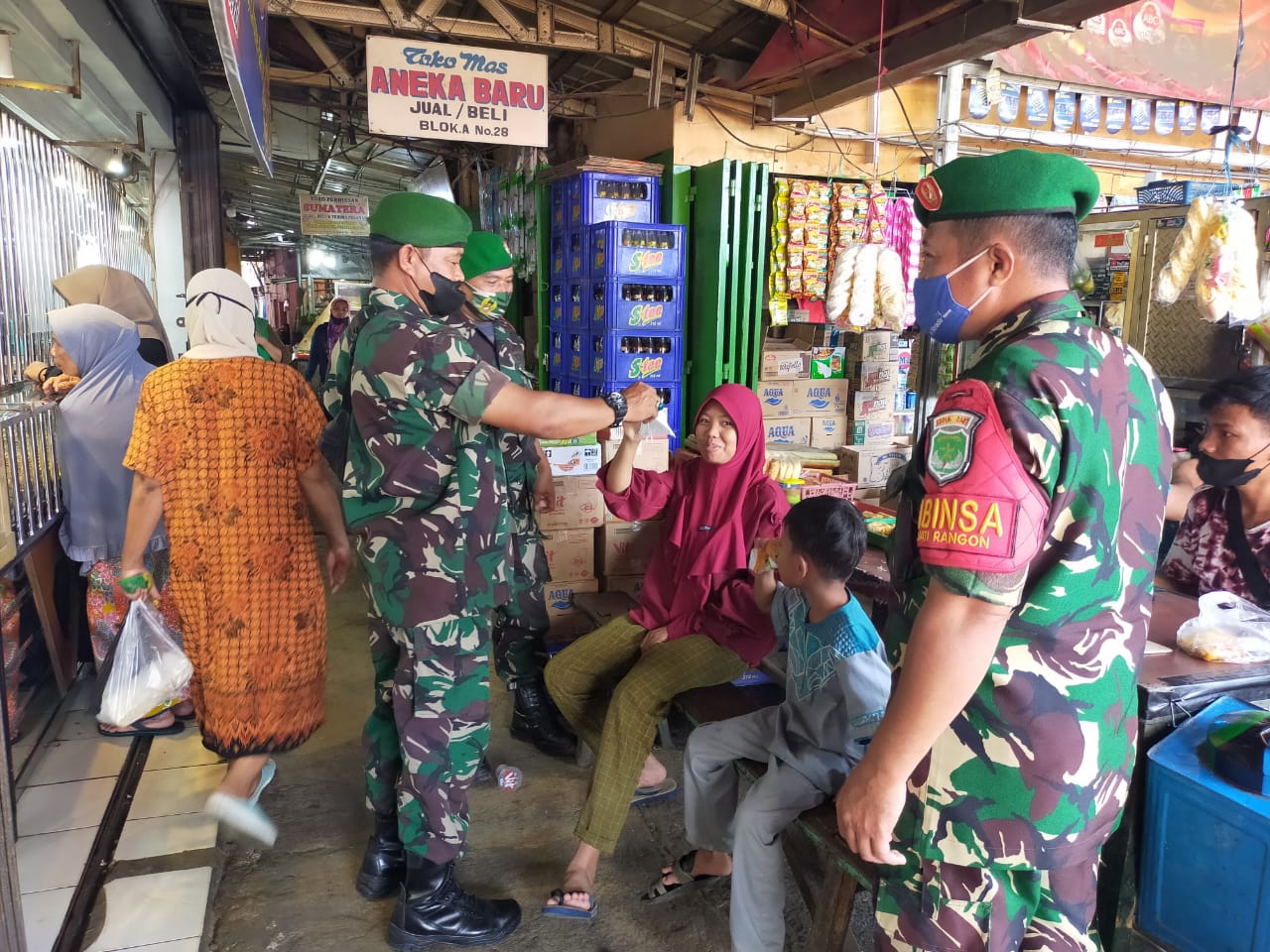 Terlihat di lokasi Babinsa Serda Agung.JS dan Serda Riswanto memberikan masker kepada pedagang di pasar kecapi jatiwarna yang kedapatan tidak memakai masker. Tidak hanya itu Babinsa tersebut juga melakukan himbauan kepada warga yang berada di pasar agar terus disiplin masker dengan membiasakan serta menerapkan 4M, memakai masker, mencuci tangan, menjaga jarak dan menghindari kerumunan.