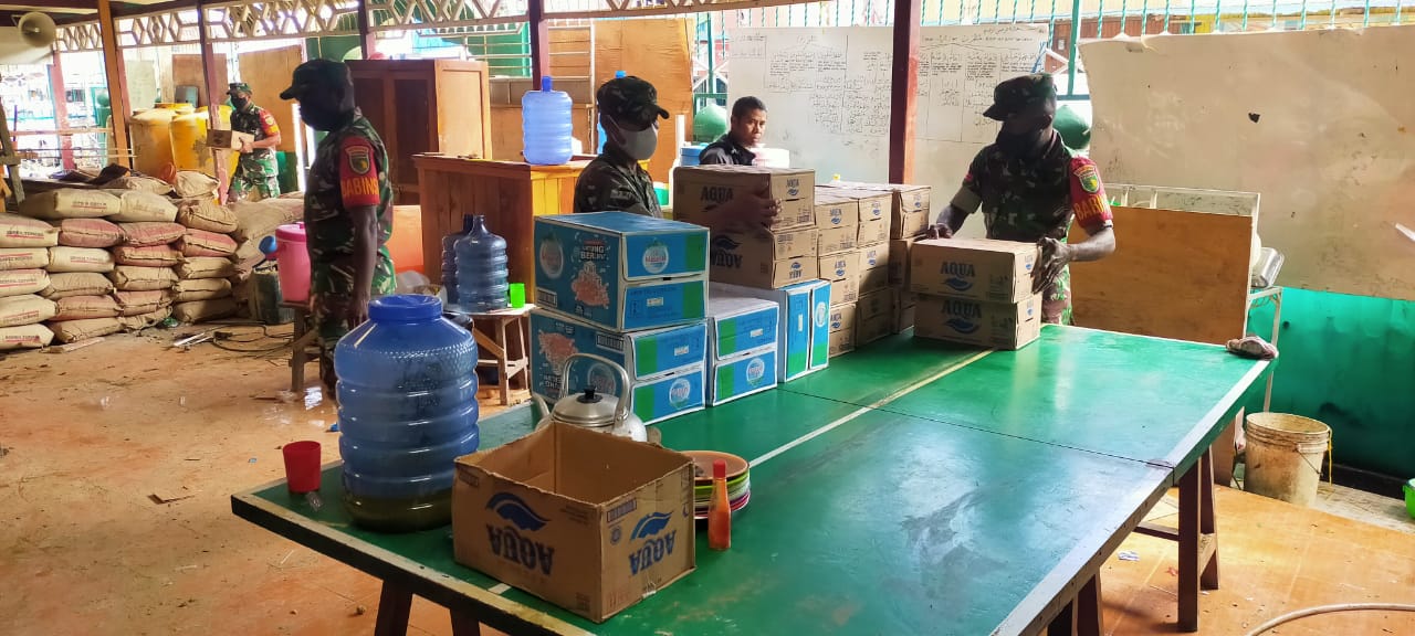 Bantuan tersebut berupa 20 karton Air minum (Aqua) yang diserahkan langsung oleh Wadanramil 1703-01/Enarotali Letda Inf Alpius Gobai kepada panitia pembangunan masjid.