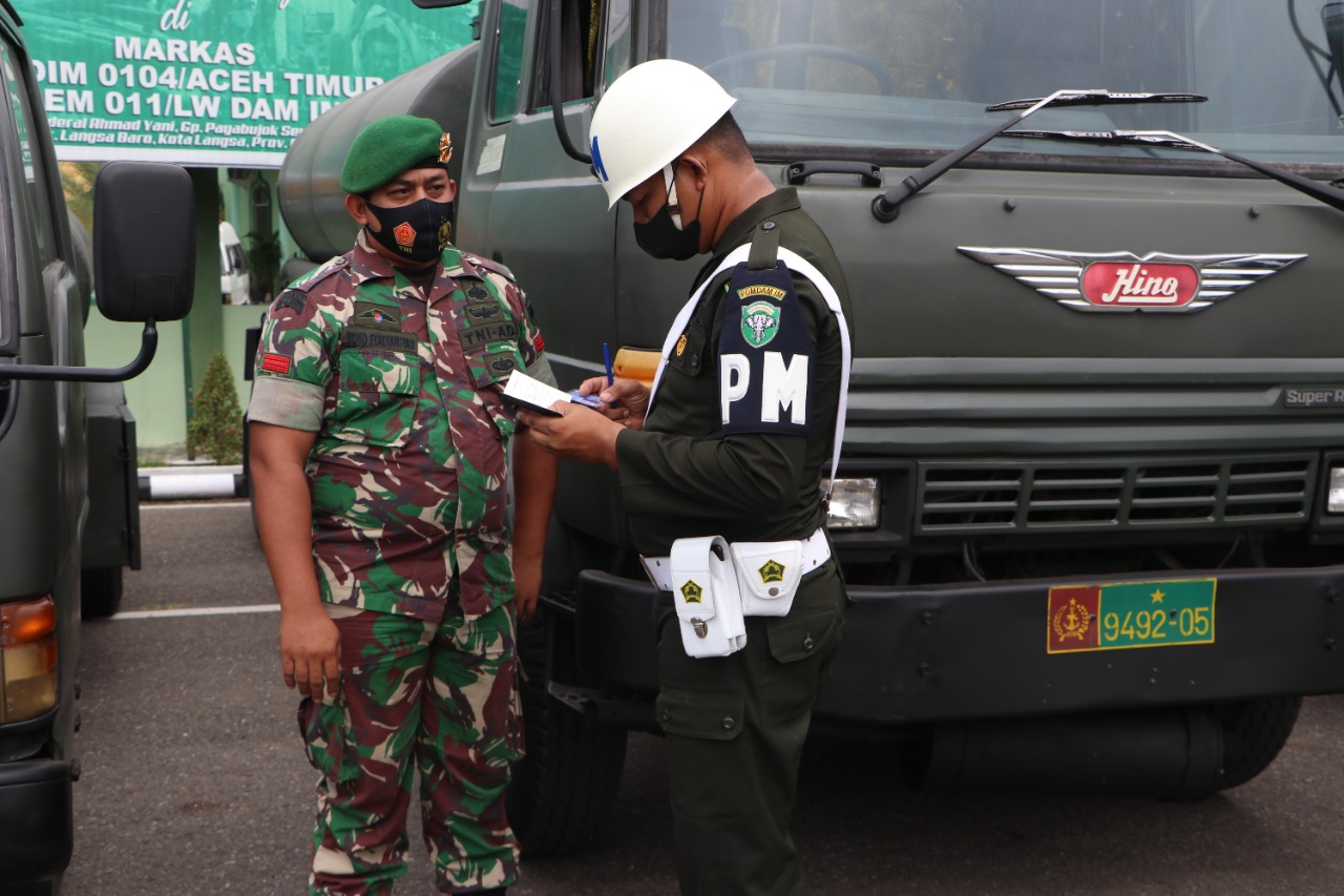 Pantauan dilokasi, Dansubdenpom IM/1-2 Langsa Lettu Cpm Muhadar berserta anggotanya memeriksa kendaraan personil Kodim 0104/Atim mulai dari SIM, Surat Tanda Nomor Kendaraan (STNK) hingga kelengkapan kendaraan.