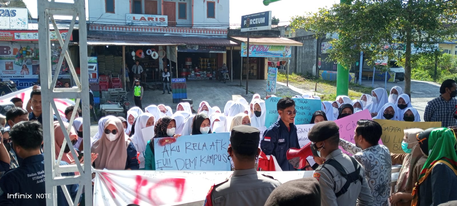 KeizalinNews.Com Redelong – Puluhan personel Polres Bener Meriah melakukan pengamanan ujuk rasa yang di gelar oleh mahasiswa STIKES payung Negeri Bener Meriah di Kampus STIKES payung Negeri Pante Raya, Kecamatan Wih Pesam, Kabupaten Bener Meriah, Selasa (29/3/22).
