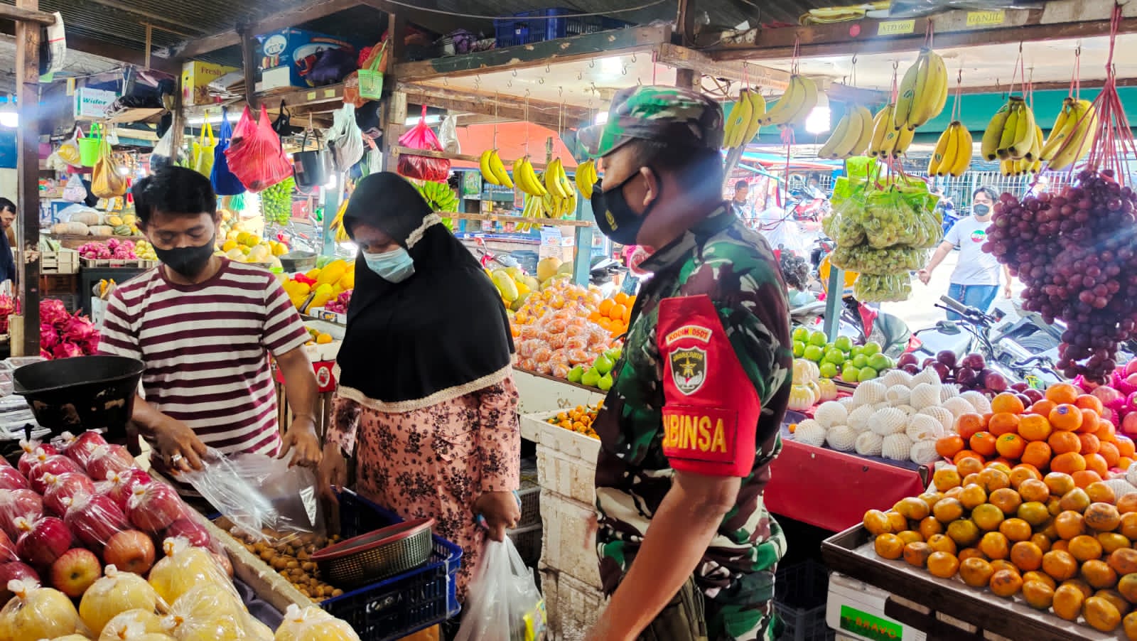 KeizalinNews.com Jakarta Pusat — Babinsa kelurahan Serdang Koramil 07/Kemayoran Serka Ahmad Fauzi melaksanakan kegiatan imbauan taat protokol kesehatan, di Pasar Serdang, kecamatan Kemayoran, Jakarta Pusat, Minggu (3/4/2022).
