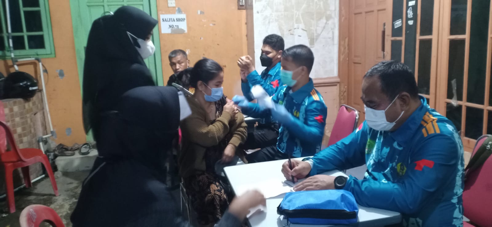 Serbuan vaksinasi yang di gelar pada malam hari ini karena banyaknya kesibukan warga yang beraktifitas disiang hari, pada kesempatan tersebut Puluhan warga yang datang langsung mendaftar dan mengisi formulir dan menunggu antrian sesuai dengan nomor urut di lokasi vaksinasi yang digelar oleh Koramil 06/Cakung.