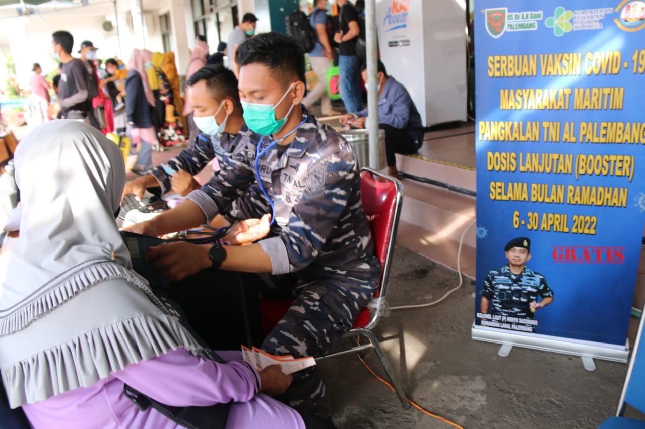 KeizalinNews.com Palembang —  Pangkalan TNI AL Palembang menggelar Serbuan Vaksinasi Covid-19 Dosis 1, 2 dan Dosis lanjutan/Booster kepada warga Kota Palembang yang dilaksanakan di Stasiun Kereta Api Kertapati Palembang, Jumat (23/4/2022).