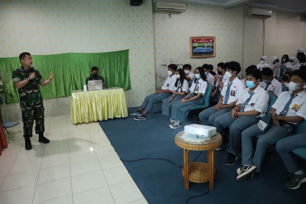 KeizalinNews.com Jakarta Selatan — Guna membangun jati diri dan membentuk karekter generasi muda serta menangkal pengaruh negatif maupun doktrin dari paham-paham radikalisme dan terorisme di kalangan pelajar, Dandim 0504/Jakarta Selatan Kolonel Inf Jamaluddin., S.I.P., mensosialisasikan wawasan kebangsaan (Wasbang) kepada siswa siswi SMA 6 Jakarta bertempat di ruang audio visual SMA 6 Jakarta, Jalan Mahakam I, No.2 Blok. C, Kebayoran Baru, Jakarta Selatan. Senin (25/4/2022).