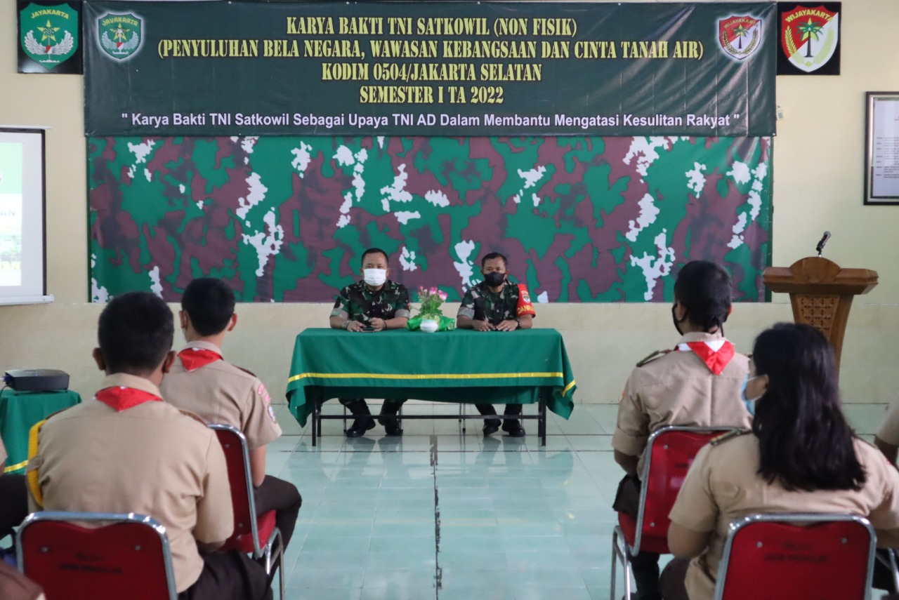 KeizalinNews.com Jakarta Selatan – Kodim 0504/JS melalui Staf Teritorial mengadakan kegiatan Progaram Karya Bakti TNI satkowil (Non Fisik) dengan menyampaikan penyuluhan Bela Negara, Wawasan Kebangsaan dan Cinta Tanah Air, kegiatan ini berlangsung di aula Makodim 0504/Jakarta Selatan, Jalan Cendrawasih Raya, Kebayoran Lama, Jakarta Selatan, Jum’at (3/6/2022) siang.