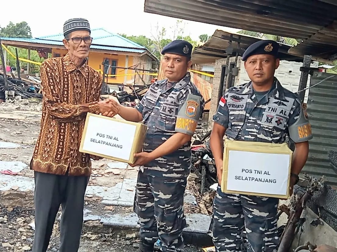 KeizalinNews.com Dumai — TNI AL Posal Selatpanjang jajaran Lanal Dumai menyerahkan bantuan sosial berupa Paket Sembako kepada warga korban kebakaran rumah di Jalan P3D, Dorak, Desa Banglas, Selatpanjang, Kecamatan Tebing Tinggi, Kabupaten Kepulauan Meranti, Riau, Sabtu (4/6/2022).