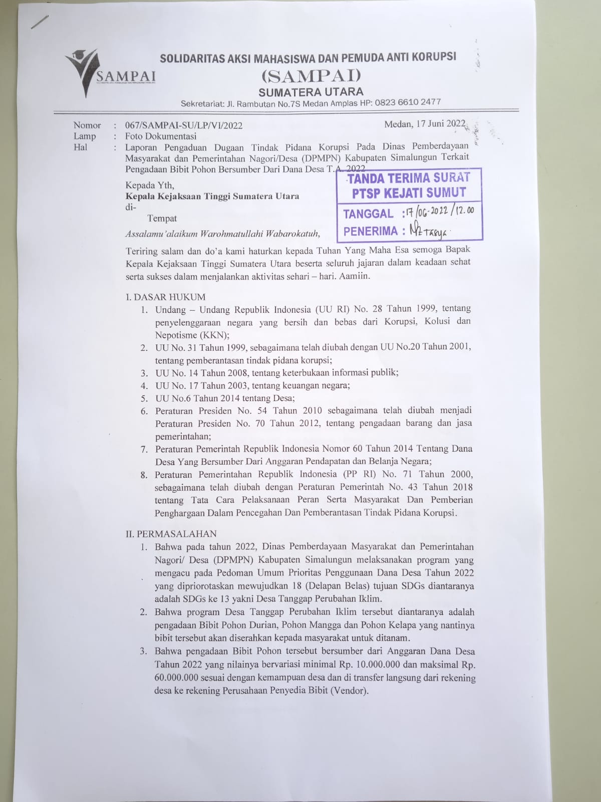 KeizalinNews.com, Sumut – Solidaritas Aksi Mahasiswa dan Pemuda Anti Korupsi (SAMPAI) Sumatera Utara layangkan surat kepada Kepala Kejaksaan Tinggi Sumatera Utara terkait dugaan tindak pidana korupsi di Dinas Pemberdayaan Masyarakat dan Pemerintahan Nagori/Desa (DPMPN) Kabupaten Simalungun terkait pengadaan bibit pohon bersumber dari Dana Desa T.A. 2022.