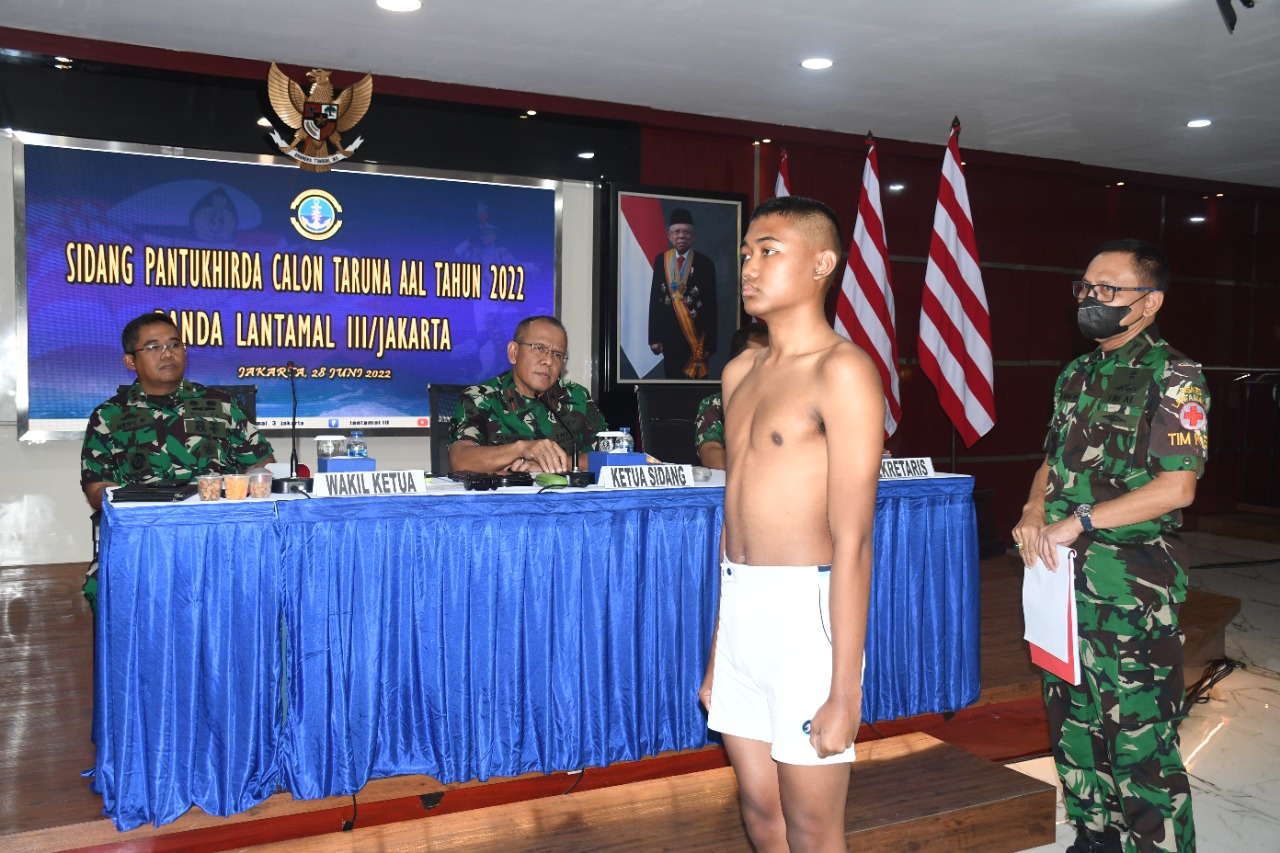 KeizalinNews.com Jakarta — Komandan Pangkalan Utama TNI AL (Danlantamal) III Brigadir Jenderal TNI (Mar) Umar Farouq, S.A.P., CHRMP., M.Tr.Opsla., M.Han, memimpin langsung sidang Penentuan Akhir Daerah (Pantukhirda) calon Taruna Akademi Angkatan Laut (AAL) Tahun 2022 Panda Jakarta di Gedung Serbaguna Mako Lantamal III, Jl. Gunung Sahari no 2 Ancol Jakarta Utara, Selasa (28/06/2022).