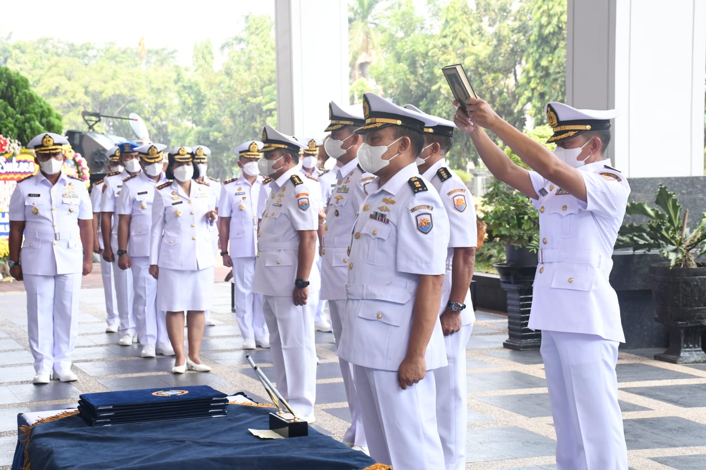 KeizalinNews.com Bandung — Komandan Lanal Bandung Kolonel Laut (KH/W) Dr. Renny Setiowati, S.T., M.Sc.,M.Tr. Hanla menghadiri kegiatan Upacara Sertijab Sertijab Asintel Danlantamal III, Asops Danlantamal III, Aspotmar Danlantamal III dan Danpomal Lantamal III yang dipimpin langsung oleh Danlantamal III Jakarta Brigjen TNI (Mar) Umar Farouq, S.A.P., CHRMP., M.Tr.Opsla., bertempat di Lapangan Apel Mako Lantamal III dan Selasar Lobi Mako Lantamal III, Rabu (29/06/2022).