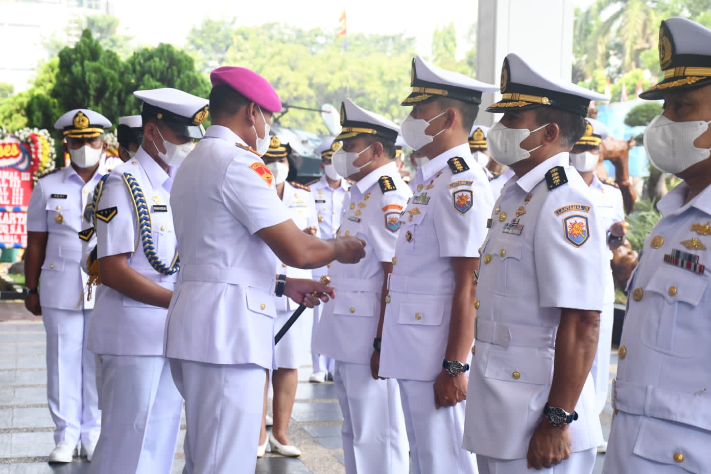 KeizalinNews.com Palembang — Komandan Lanal Palembang Kolonel Laut (P) Widyo Sasongko, S.E., M.Tr. Hanla., menghadiri Upacara Sertijab Asintel Danlantamal III, Asops Danlantamal III, Aspotmar Danlantamal III, dan Danpomal Lantamal III yang dipimpin langsung oleh Danlantamal III Jakarta Brigjen Mar Umar Farouq, S.A.P., CHRMP., M.Tr.Opsla., bertempat di Lapangan Apel Mako Lantamal III dan Selasar Lobi Mako Lantamal III, Rabu (29/6/2022).