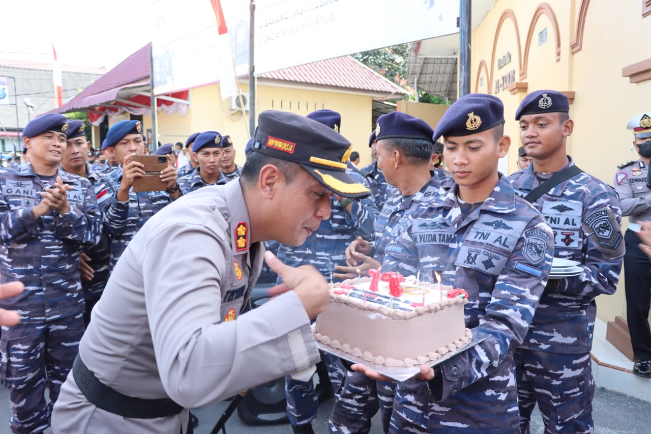 Kedatangan rombongan Danlanal TBA dengan membawa kue tart sambil menyanyikan selamat ulang tahun, disambut langsung oleh Kapolres Tanjungbalai AKBP Triyadi bersama jajaran Polres Tanjungbalai.