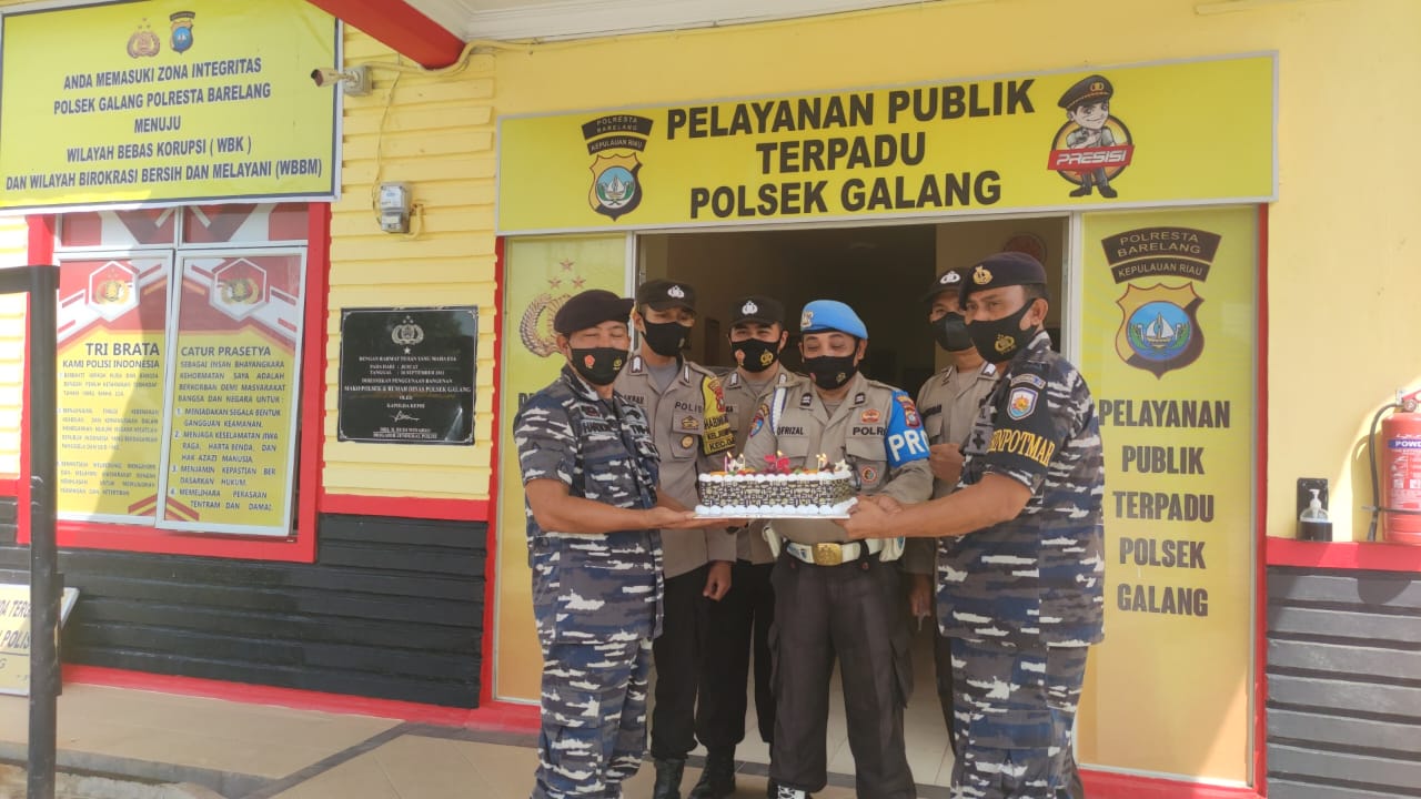 KeizalinNews.com Batam — Prajurit Posal Telaga Punggur, Posal Galang dan Babinpotmar Jajaran Lanal Batam mendatangi Mapolsek Nongsa dan Galang jajaran Polresta Barelang secara mendadak dengan tujuan melaksanakan kegiatan suprice pemberian kue tar dan ucapan selamat HUT ke-76 Bhayangkara kepada Kapolsek Nongsa dan Kapolsek Galang beserta Staf, Jumat (01/07/2022).