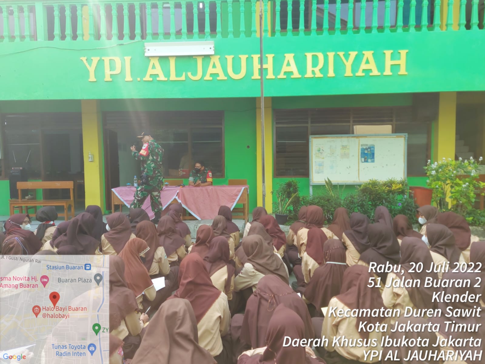 Seperti dalam masa pengenalan lingkungan sekolah, para siswa siswi diberikan latihan sikap disiplin dan wawasan kebangsaan guna menumbuhkan jiwa semangat sebagai seorang pelajar MA/MTS yang merupakan penerus generasi muda bangsa, oleh karena itu Babinsa Koramil 08/Duren sawit Serda Edy Supriyadi, Kaptu Andreas memberikan Wasbang tentang Nilai-nilai Pancasila serta kedisiplinan kepada siswa-siswi Madrasah Aliyah dan Madrasah Tsanawiyah, bertempat di Yayasan Alwatoniyah Al-Jauhariyah RW.13 Kelurahan Klender, Duren sawit, Rabu (20/07/22).
