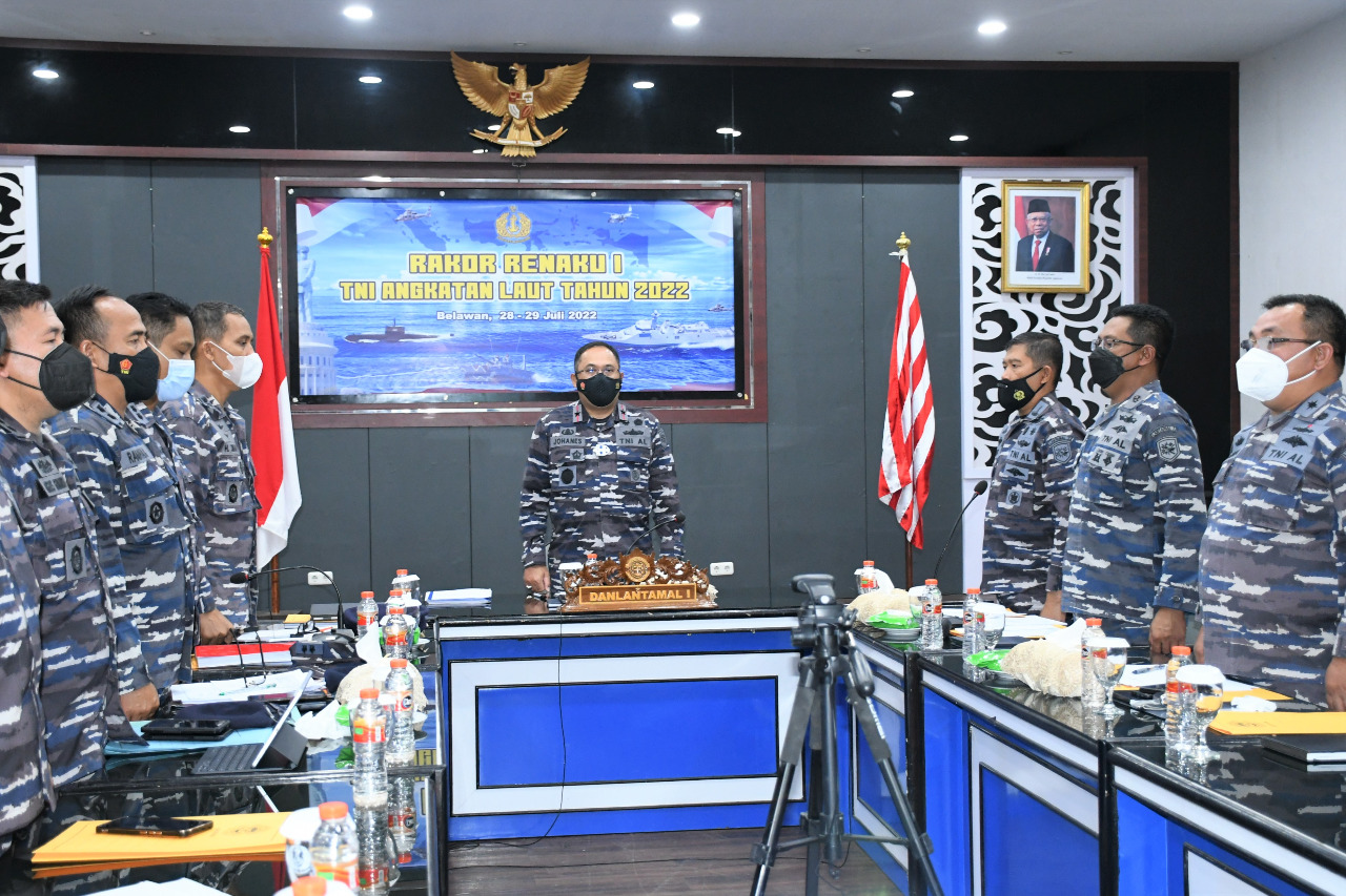 KeizalinNews.com Belawan — Komandan Pangkalan Utama TNI AL I (Danlantamal I) Belawan Laksamana Pertama TNI Johanes Djanarko Wibowo mengikuti Rapat Koordinasi Perencanaan dan Keuangan I (Rakor Renaku I) TNI AL Tahun 2022 secara vicon dari Gedung Yos Sudarso Markas Komando Lantamal I, Jalan Serma Hanafiah No, 01 Belawan, Medan, Sumatera Utara, (28/07/2022).