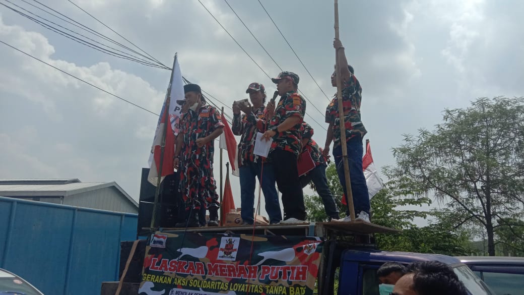 Serang – Aksi demo yang di lakukan oleh Ratusan ormas Laskar Merah Putih (LMP), di depan PT.Sunggo Metal Cemerlang di Jl raya cikande rangkas bitung, Desa cemplang, Kecamatan jawilan, Kabupaten Serang, Provinsi Banten. Kamis 4 Agustus 2022.