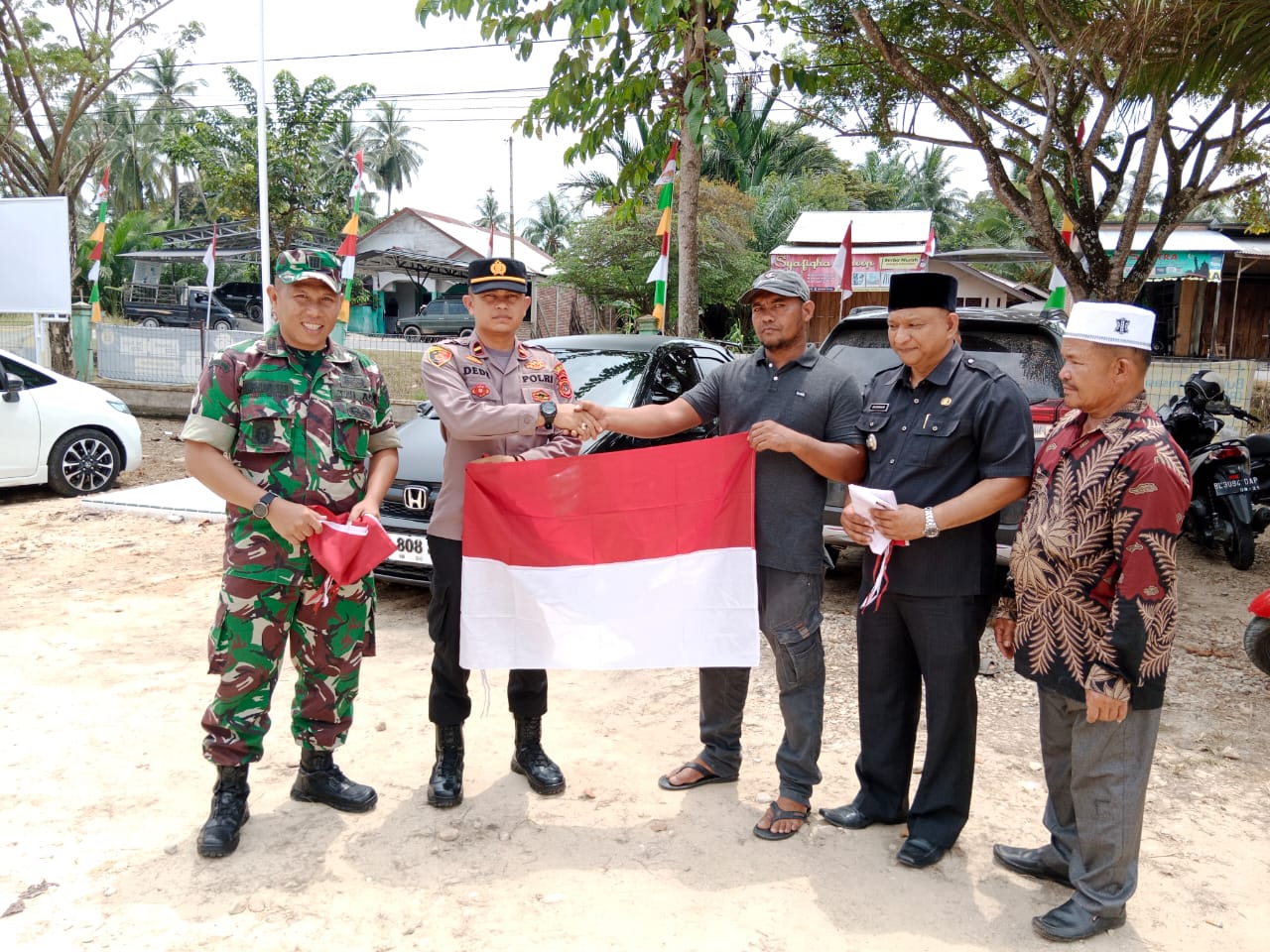 Pembagian bendera yang berlangsung di halaman Kantor Camat Peureulak Barat ini dilakukan oleh Camat Murdani, S.STP.,M.Si., bersama Kapolsek Ipda Dede Moerdhany, S.H. serta Danramil 14/PLKB Kapten Inf Irwansyah.
