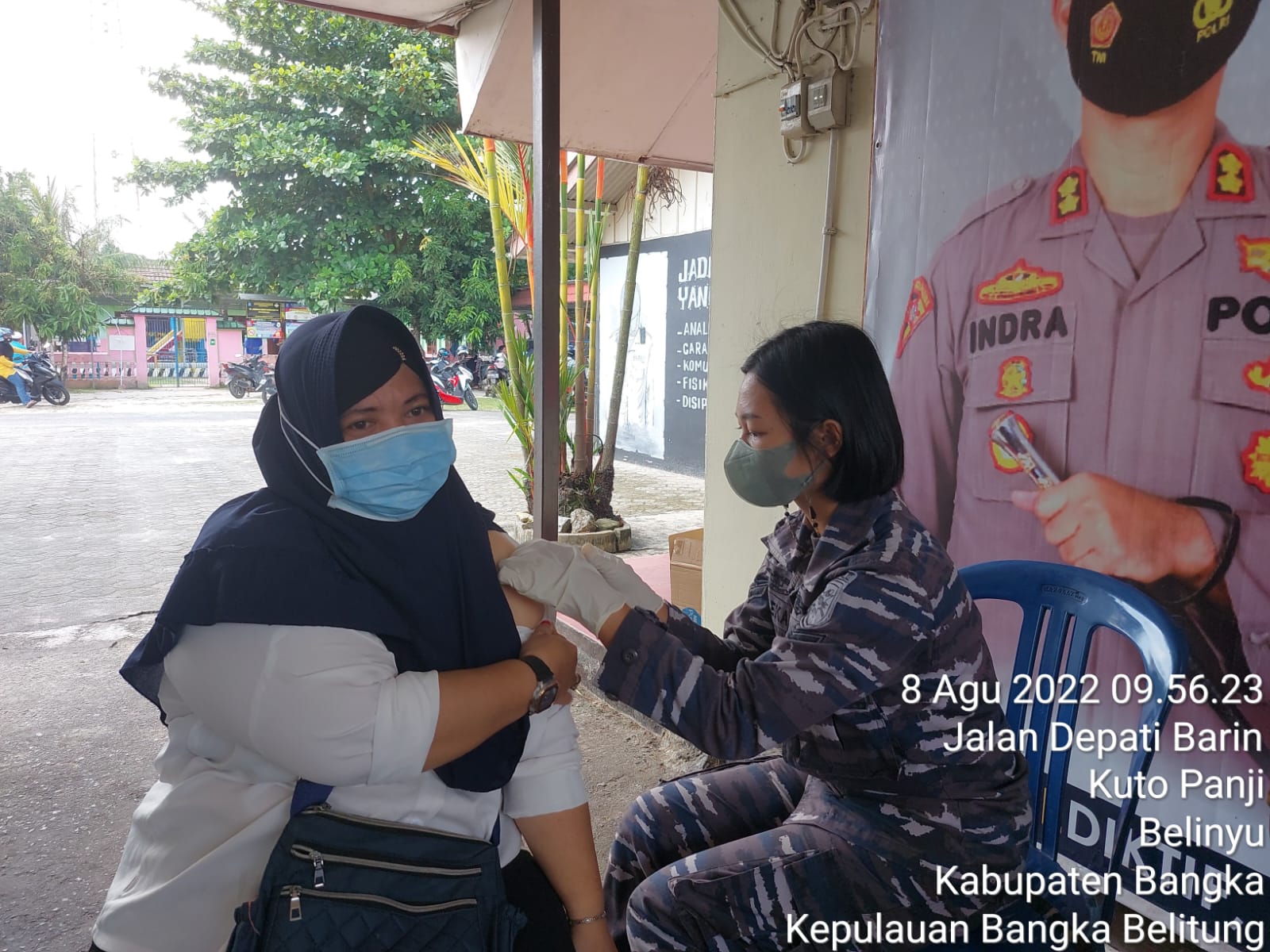 KeizalinNews.com Belinyu — Jajaran Lantamal III Jakarta Lanal Bangka Belitung terus berupaya memutus mata rantai Virus Corona dan mencegah masuknya varian baru Covid-19 seperti subvarian Omicron BA.4 dan BA.5 dalam serbuan Vaksinasi maritim melalui Balai Kesehatan yang bekerjasama dengan Puskesmas Belinyu melaksanakan serbuan Vaksinasi di Mako Polsek Belinyu, Jumat (08/08/2022).