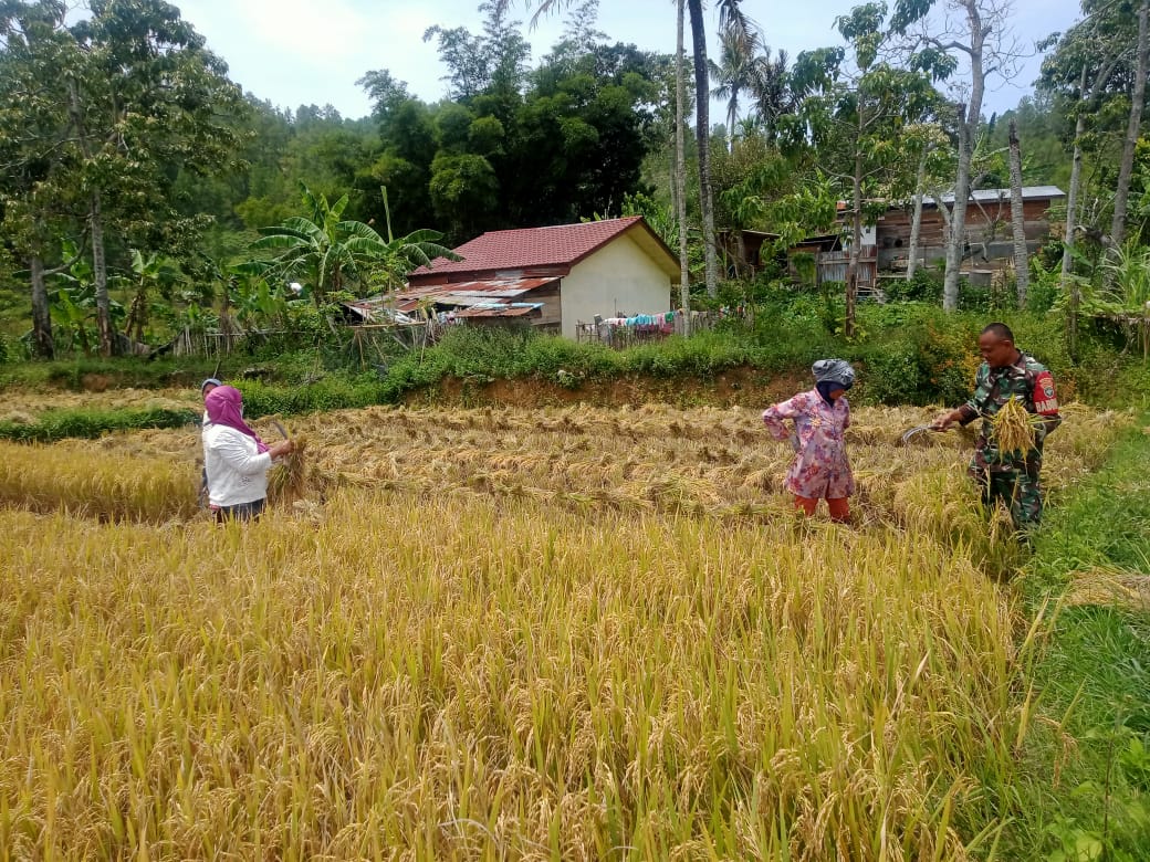 Babinsa dalam mendukung Ketahanan Pangan (Hanpangan) dengan semangat ikut serta terjun langsung ke sawah untuk membantu para petani desa binaannya saat memanen padi agar terwujudnya kemanunggalan TNI dengan Rakyat