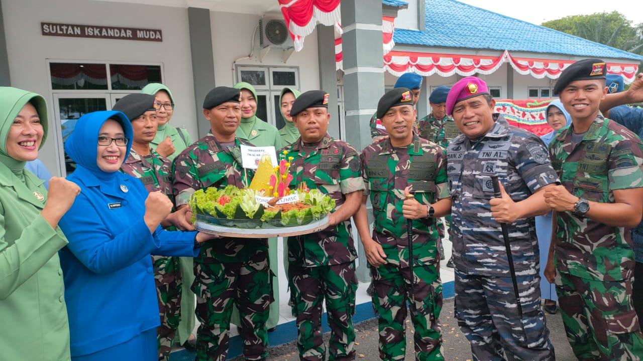 KeizalinNews.com Aceh Utara — Dihari Ulang Tahun TNI Angkatan Laut ke-77 tepat tanggal 10 September 2022, Komandan Pangkalan TNI Angkatan Laut (Danlanal) Lhokseumawe Kolonel Marinir Dian Suryansyah didampingi Ketua Jalasenastri Cabang 6 Korcab I DJA I Ny. Indri Dian Suryansyah mendapat surprise/kejutan ucapan Selamat Ulang Tahun dari Dandim 0103/Aceh Utara Letkol Inf Hendrasari Nurhono yang didampingi Ketua Persit Kartika Chandra Kirana Cabang XX/Dim 0103 Aceh Utara Ny. Dina HS Nurhono, bersama Dansatrad 231 Lhokseumawe Mayor Lek Agung Nugroho, Danyon Kav 11/MSC Letkol Kav Ino Dwi Seryo Darmawan, Danki B Yonko 469 Paskhas Kapten Pas Agil G Gumilar, Danden Arhanud 001/CSBY Kapten Arh Hedro Ramadani, Kapolsek Dewantara Iptu Subihan, Camat Dewantara Nawafil Mahyuda beserta rombongan yang mendatangi Mako Lanal Lhoksemawe, Jalan PT. KKA KM 2, Desa Paloh Igeuh, Kecamatam Dewantara, Kabupaten Aceh Utara, dengan membawa Tumpeng dan Kue Ulang Tahun dalam rangka Hari Ulang Tahun (HUT) TNI Angkatan Laut ke-77 Tahun 2022, Sabtu,(10/09/2022).