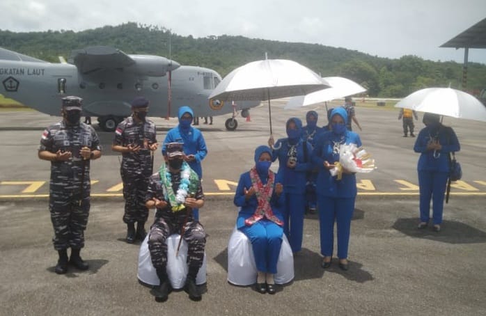 Setibanya di Bandara Lanudal Matak, Danlantamal IV dan rombongan disambut dengan acara adat Tepung Tawar.