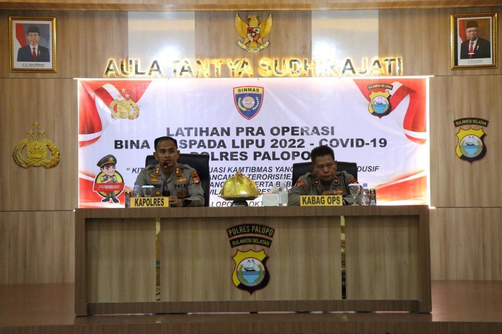 KeizalinNews.Com, Palopo — Bertempat di Aula Tantya Sudhirajati Polres Palopo dilaksanakan Lat Pra Ops Bina Waspada Lipu 2022 dengan Tema Melalui Lat Pra Ops Kepolisian Kewilayahan Bina Waspada Lipu 2022 Kita Wujudkan Situasi Kamtibmas yang aman dan Kondusif Bebas dari Ancaman Terorisme, Radikalisme dan Anti Pancasila serta bebas Covid 19 di Wilayah hukum Polres Palopo .