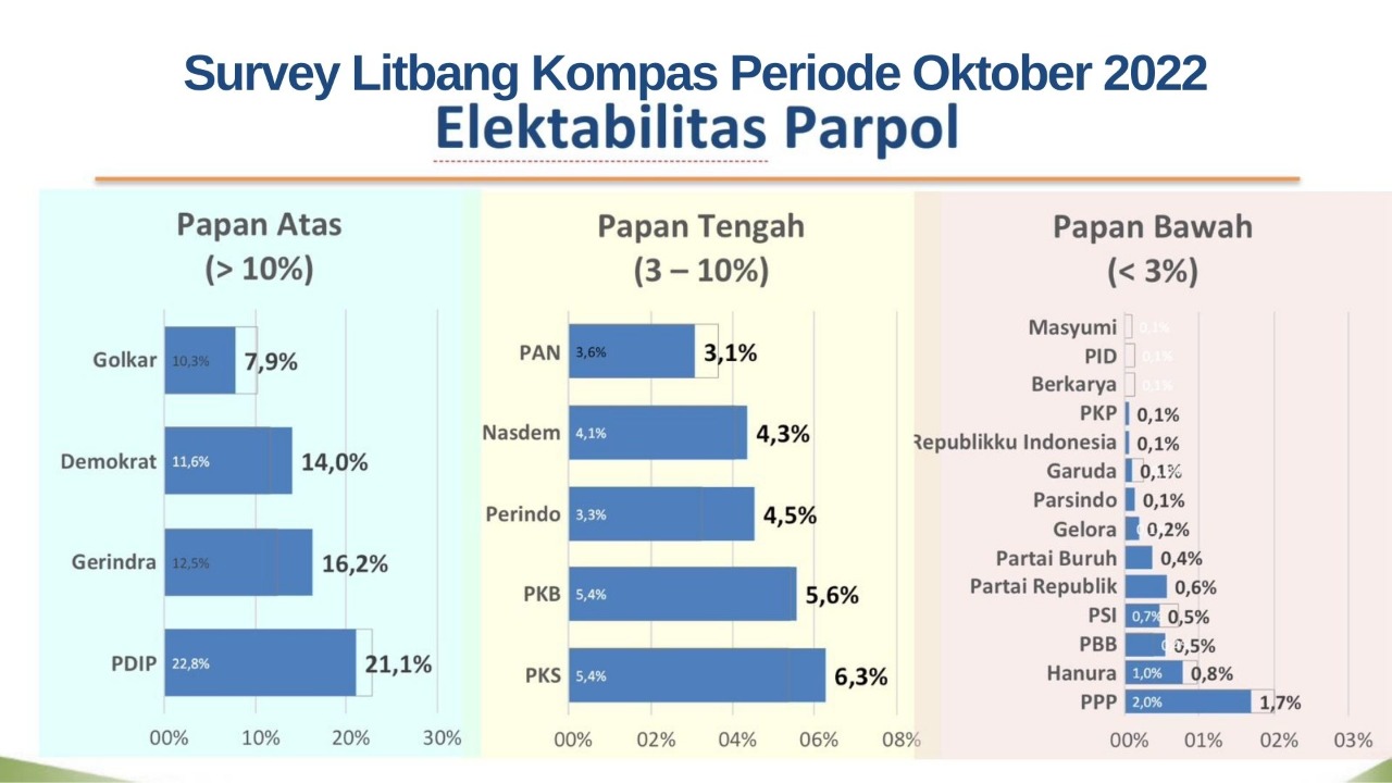 “Di papan tengah elektabilitas parpol, makin kokoh eksistensi pemain baru dari papan bawah, yakni Partai Perindo. Jika pada Juni lalu Perindo baru meraih elektabilitas 3,3 persen, pada Oktober 2022 ini 4,5 persen,” dikutip dari harian Kompas, Selasa (25/10/2022).