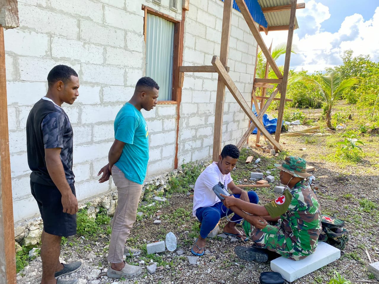 KeizalinNews.com Biak — Personel Satuan Tugas TNI Manunggal Membangun Desa (TMMD) Serda Asri Tim kesehatan dari Denkesyah yang tergabung dalam satgas TMMD rutin melakukan pemeriksan kesehatan terhadap anggota satgas TMMD maupun Warga yang berada di Sekitar Lokasi TMMD di Kampung Sorido, Distrik Biak Kota, Kabupaten Biak Numfor, Kamis (27/10/2022).