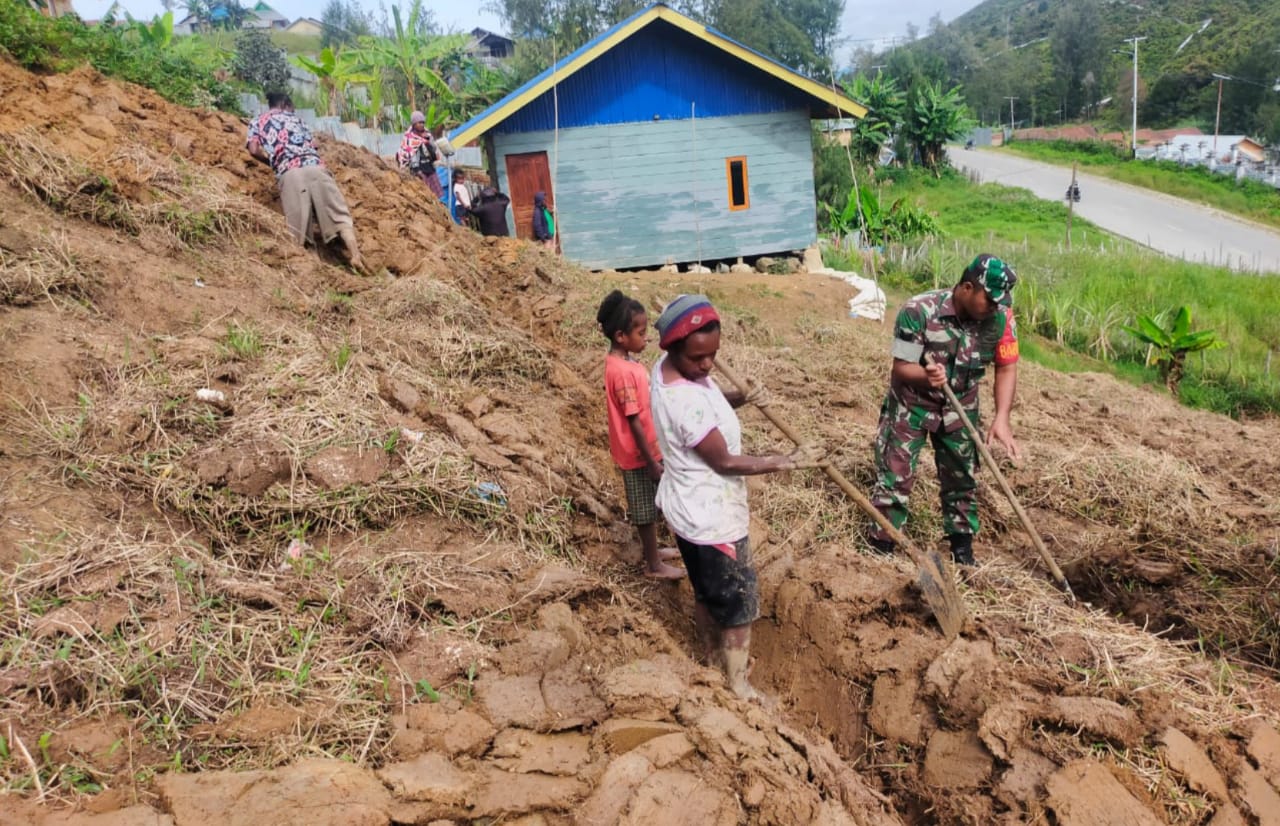 KeizalinNews.com Paniai — Babinsa Koramil 1703-01/Enarotali Kodim 1703/Deiyai Serka Edi.M.Haan membantu petani membuat beden di lahan kebun milik petani mama Agustina Nawipa seluas 0.15 hektar di Kampung Timida Distrik Paniai Timur Kabupaten Paniai, Senin (31/10/2022).
