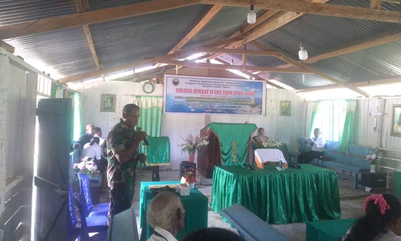 KeizalinNews.com Yapen — Dalam rangka turut menyukseskan Kegiatan Sidang Jemaat diwilayah binaannya, mewakili Danramil, Sertu Jhonias M. Riyoli Babinsa Koramil 1709-02/Yapen Timur Kodim 1709/Yawa menghadiri Kegiatan Sidang Jemaat II GKI Sion di Kampung Sere-sere Distrik Yapen Timur Kabupaten Kepulauan Yapen, Selasa (08/11/2022).