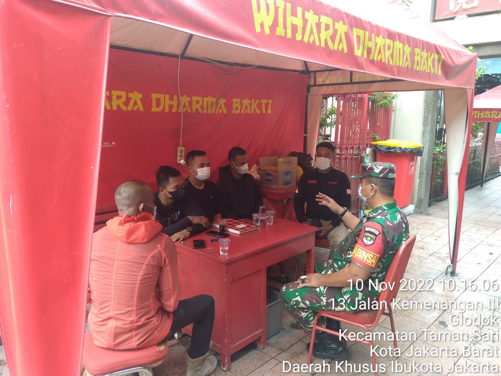 KEIZALINNEWS Kodam Jaya, Kodim 0503/JB – Bertempat di Jalan Kemenangan III, Rw. 02 Kel. Glodok Kec.Tamansari Jakarta barat Babinsa Koramil 01/Tamansari Kodim 0503/JB Serda Amramus melaksanakan Komunikasi Sosial (Komsos) dengan Security Wihara Dharma Bakti dalam rangka silaturahmi, untuk menjaga hubungan baik di wilayah binaan