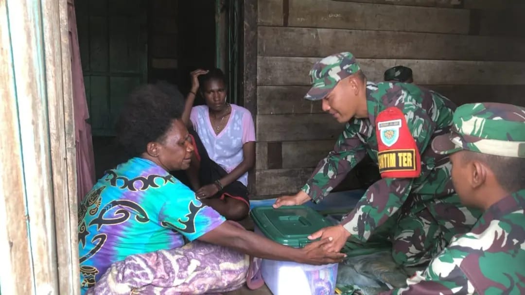 KeizalinNews.com Puncak Jaya — Selalu peduli dan terus melakukan kegiatan kemanusiaan, Satgas Satuan Organik Yonif Raider 301/Pks Posramil ILU memberikan tali asih berupa sembako kepada mama Yantimira Kogoya salah satu warga binaan di Kampung Wurak, Distrik ILU, Kab. Puncak Jaya, Papua.