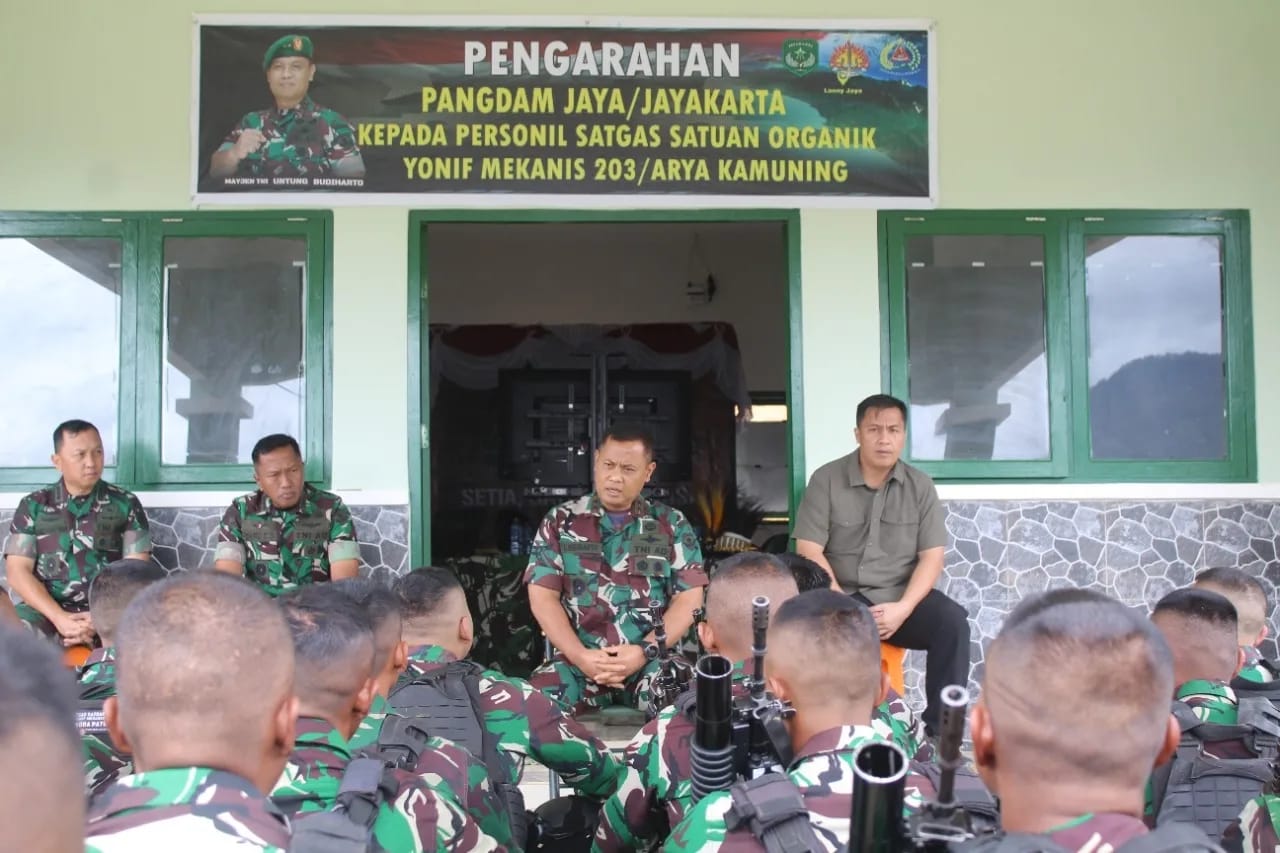 KEIZALINNEWS Kodam Jaya – Papua. Dibawah pimpinan Danyonif Mekanis 203/AK Mayor Inf Achmad Zaki, Pangdam Jaya Mayjen TNI Untung Budiharto memberikan pengarahan dan motivasi kepada personel Satgas bertempat di Posko Satgas Yonif Mekanis 203/AK, Kab. Lanny Jaya, Papua. Rabu, (16/11/2022)