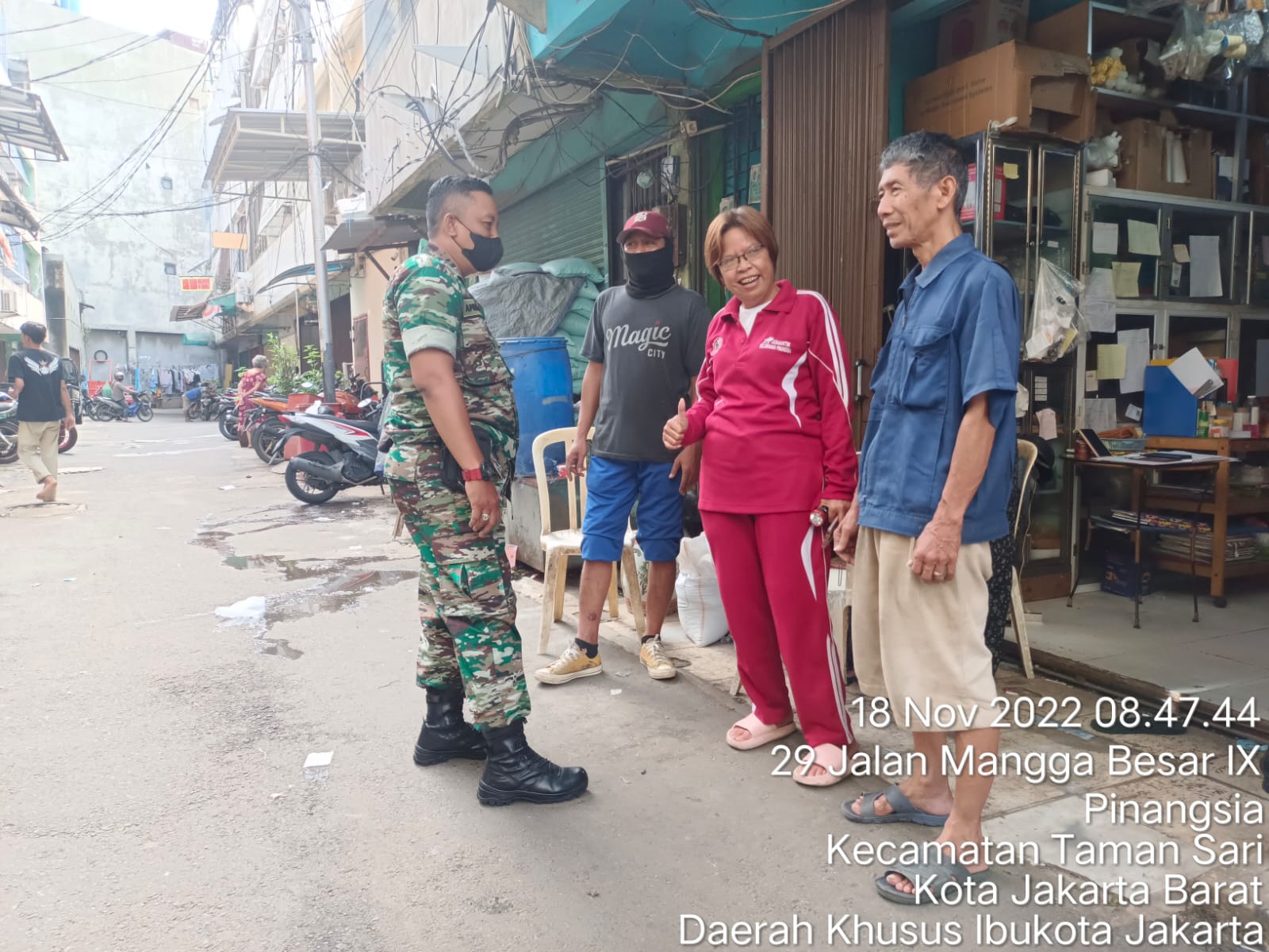 Komsos yang dilaksanakan Babinsa mengambil tempat di wilayah Rw. 01 Pasar Pecah Kulit Jalan Mangga Besar IX, Rt 07/01, Kel. Pinangsia, Kec. Tamansari, Jakarta Barat. Jum’at (18/11/22)