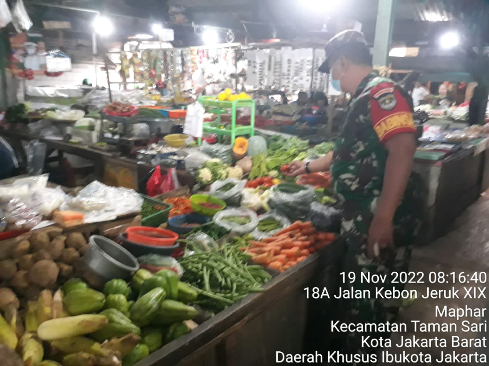 KEIZALINNEWS Kodam Jaya, Kodim 0503/JB – Serda Amramus Babinsa Koramil 01/Tamansari Kodim 0503/JB kembali melaksanakan pengecekan perkembangan harga sembako di PD Pasar Maphar Jalan Kebun Jeruk XIX, Rt. 03/09, Kel. Maphar, Kec. Tamansari, Jakarta Barat. Sabtu (19/11)