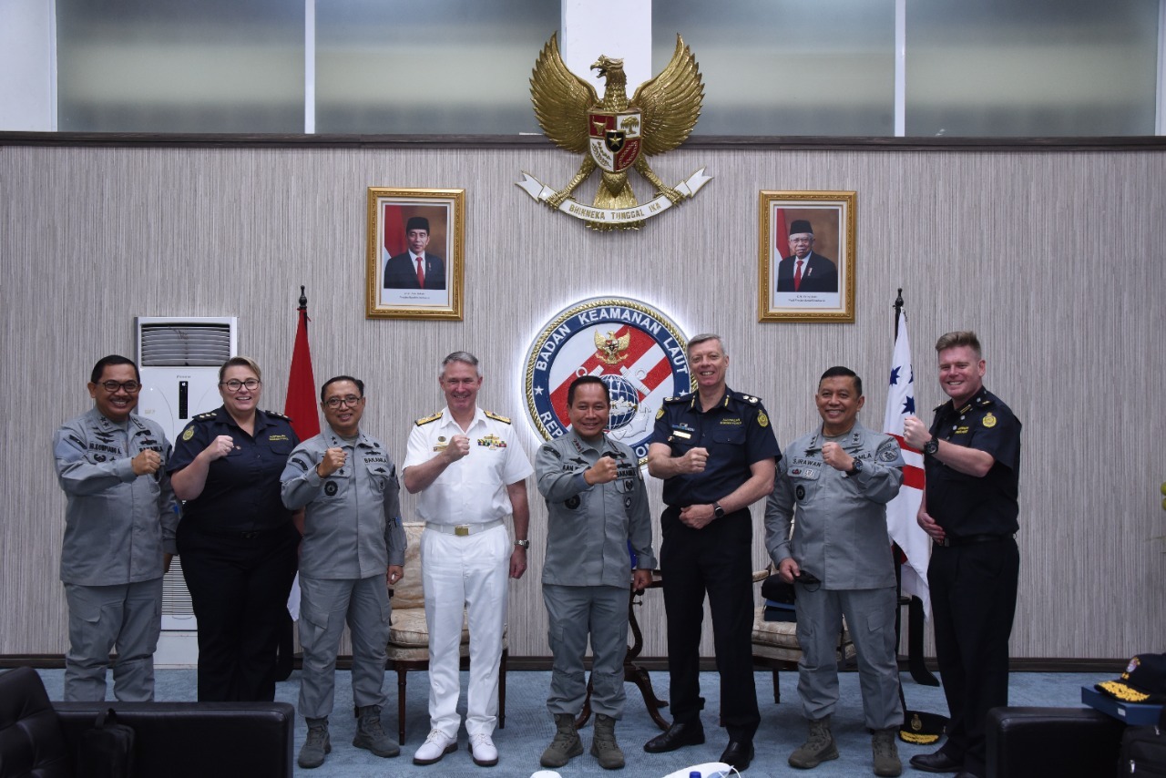 KeizalinNews.com Jakarta — Kedatangan Deputy Commissioner North, West and Detention ABF Mr. Tim Fitzgerald dan Commander MBC RADM Justin Jones, dengan hormat diterima oleh Kepala Bakamla RI Laksdya TNI Dr. Aan Kurnia, dalam Courtesy Call ke Mabes Bakamla RI. Para Delegasi diterima dan melakukan pembahasan di Aula 1 Mabes Bakamla RI, Jakarta Pusat, Senin, (05/12/22).