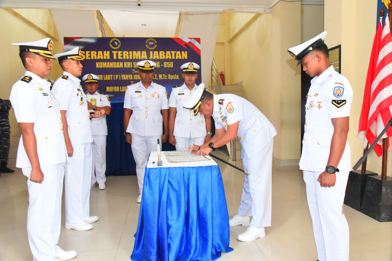 Mayor Laut (P) Yahya Junarko Komandan KRI Sembilang-850 menyerahkan jabatan kepada Mayor Laut (P) Rifqi Muarief sebagai Pejabat Komandan KRI Sembilang-850 yang baru terhitung mulai tanggal 10 Desember 2022.
