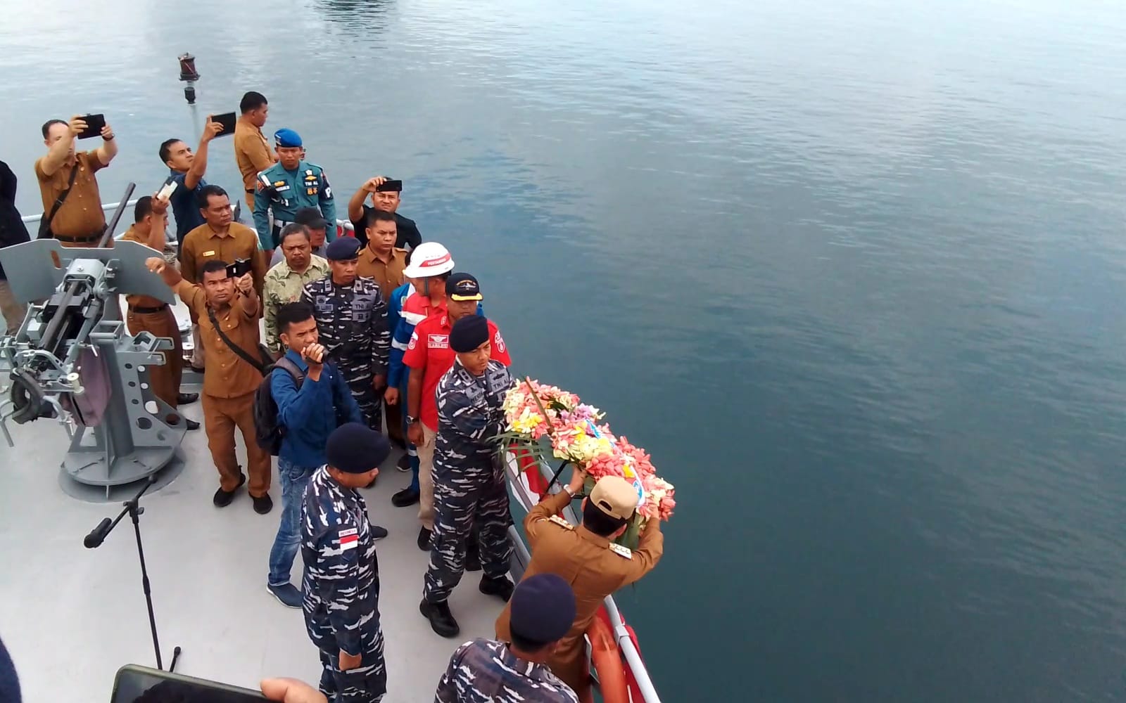 KeizalinNews.com Simeulue — Dalam rangka mengenang tragedi tsunami 18 tahun yang lalu, Pangkalan TNI AL Simeulue bersama Jurnalis Kabar Simeulue melaksanakan tabur bunga di laut dipimpin oleh Pj. Bupati Simeulue Ahmadlyah didampingi Komandan Lanal Simeulue Letkol Laut (P) Hendra Dwinanto, S.H., M.Tr.Opsla, tabur bunga dilakukan dari atas Kapal Angkatan Laut (KAL) Sinabang di Perairan Teluk Sinabang, Selasa (27/12/2022).