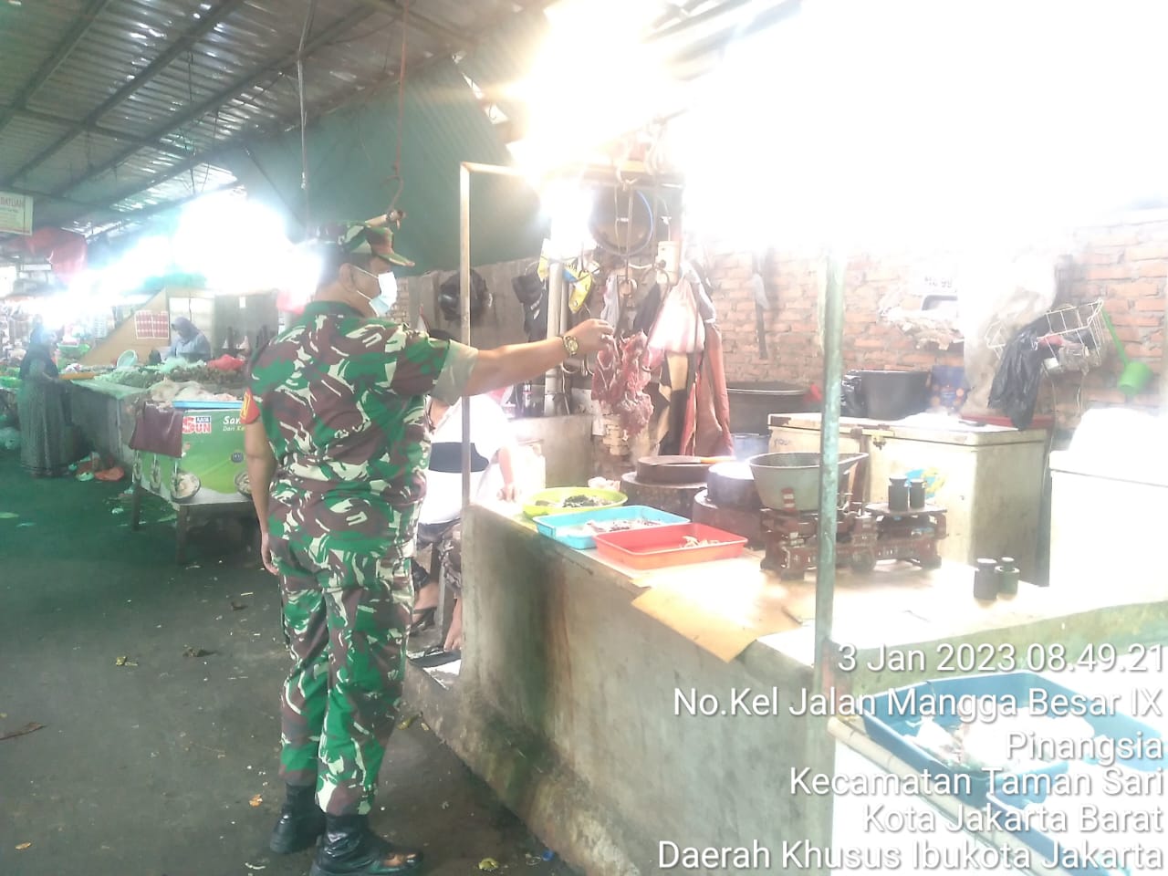 KeizalinNews Kodam Jaya, Kodim 0503/JB – Pemantauan perkembangan harga sembako terus di laksanakan oleh Babinsa Koramil 01/Tamansari Kodim 0503/JB, Serda Amramus yang hari ini Selasa 03 Januari 2023 turun langsung ke pasar Pecah kulit Jalan Manga Besar IX, Rt. 002/001, Kel. Pinangsia, Kec. Tamansari, Jakarta Barat.