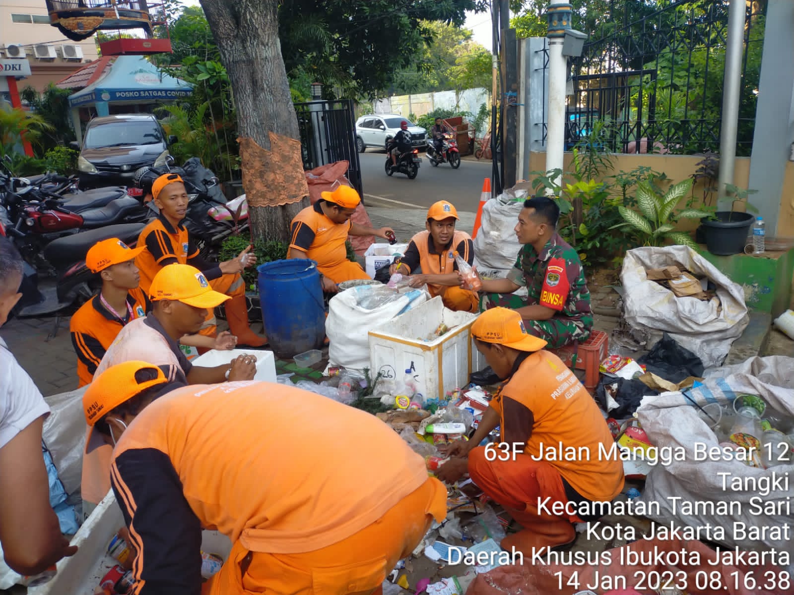 KeizalinNews Kodam Jaya, Kodim 0503/JB – Sertu Suharno Babinsa Koramil 01/Tamansari melaksanakan Komsos dengan PPSU dan Petugas Bank Sampah Kelurahan di Kel.Tangki Kec.Tamansari Jakarta Barat. Sabtu (14/01/23)