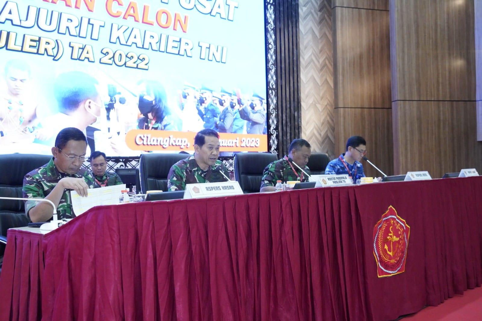 KeizalinNews (Puspen TNI) -Asisten Personel (Aspers) Panglima TNI Marsda TNI Samsul Rizal, S.I.P., M.Tr.(Han) selaku Ketua Panitia Pusat Penerimaan Calon Perwira Prajurit Karier (Pa PK) TNI Reguler TA 2022, didampingi Wadankodiklat TNI Marsda TNI Hesly Paat, Aspers Kasad Mayjen TNI Darmono Susastro, S.I.P, Aspers Kasal Laksda TNI Irwan Achmadi, M.Tr.(Han) dan Aspers Kasau Marsda TNI Elianto Susetio, S.IP., M.Si., memimpin rapat Sidang Pantukhir (Panitia Penentuan Terakhir) Pusat Penerimaan Calon Perwira Pa PK TNI Reguler, bertempat di GOR Ahmad Yani Mabes TNI Cilangkap, Jakarta Timur, Selasa (17/1/2023).
