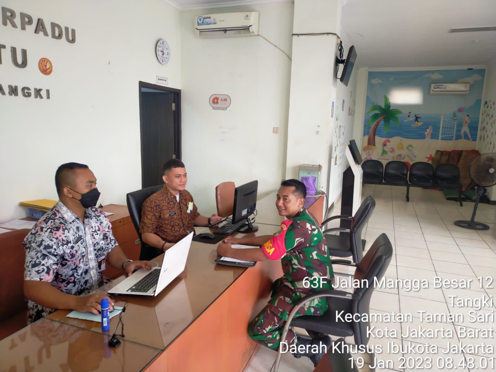Dengan berkunjung ke Dukcapil di Kantor Kelurahan Tangki Jalan Mangga Besar VII, RT. 001/002, Kel. Tangki Kec.Tamansari Jakarta Barat Babinsa Komsos bertujuan mengoptimalkan kerjasama yang baik dalam mendukung tugas pokok Babinsa.”Tentunya, dalam rangka mewujudkan kemanunggalan TNI dengan Rakyat serta sinergi dengan aparat pemerintah yang ada di wilayah. Kamis (19/1/23)