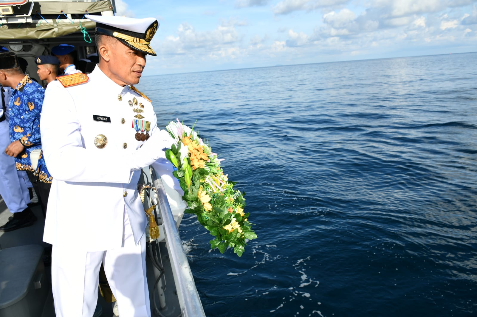 KeizalinNews.com Sabang — Dalam rangka memperingati Hari Dharma Samudera Tahun 2023, TNI Angkatan Laut Wilayah Sabang menggelar Upacara Tabur Bunga di Laut menggunakan KAL Iboih I-1-71, dengan Inspektur Upacara Danguskamla Koarmada I Laksma TNI Isswarto, M.Tr.Opsla., CHRMP., di Perairan Teluk Sabang, Senin (16/01/2023).