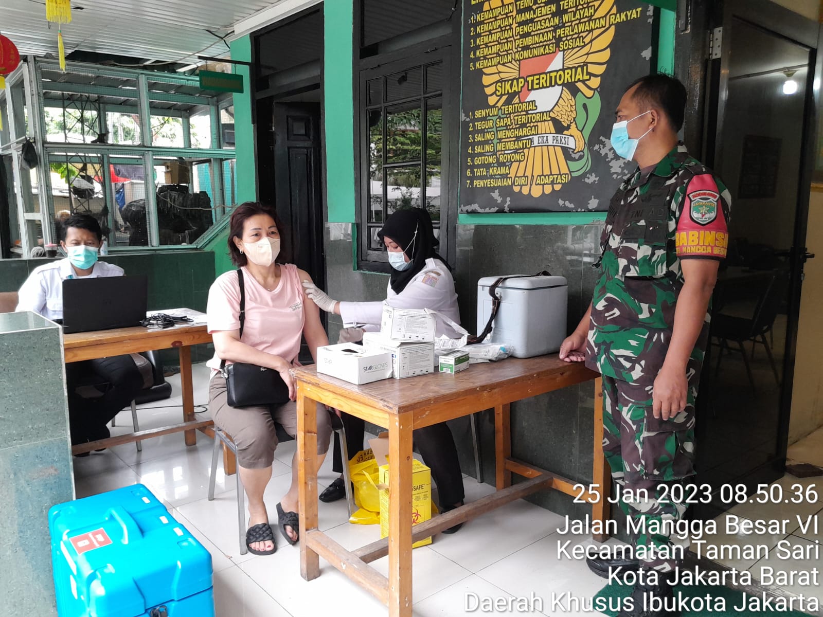 KeizalinNews Kodam Jaya, Kodim 0503/JB – Koramil 01/Tamansari bersama Puskesmas Tamansari menggelar serbuan vaksinasi di Makoramil 01/Tamansari di Jalan Mangga Besar VI Utara yang langsung di pimpin Danramil Mayor Inf Mulia Adi Dharma selaku penanggung jawab kegiatan.