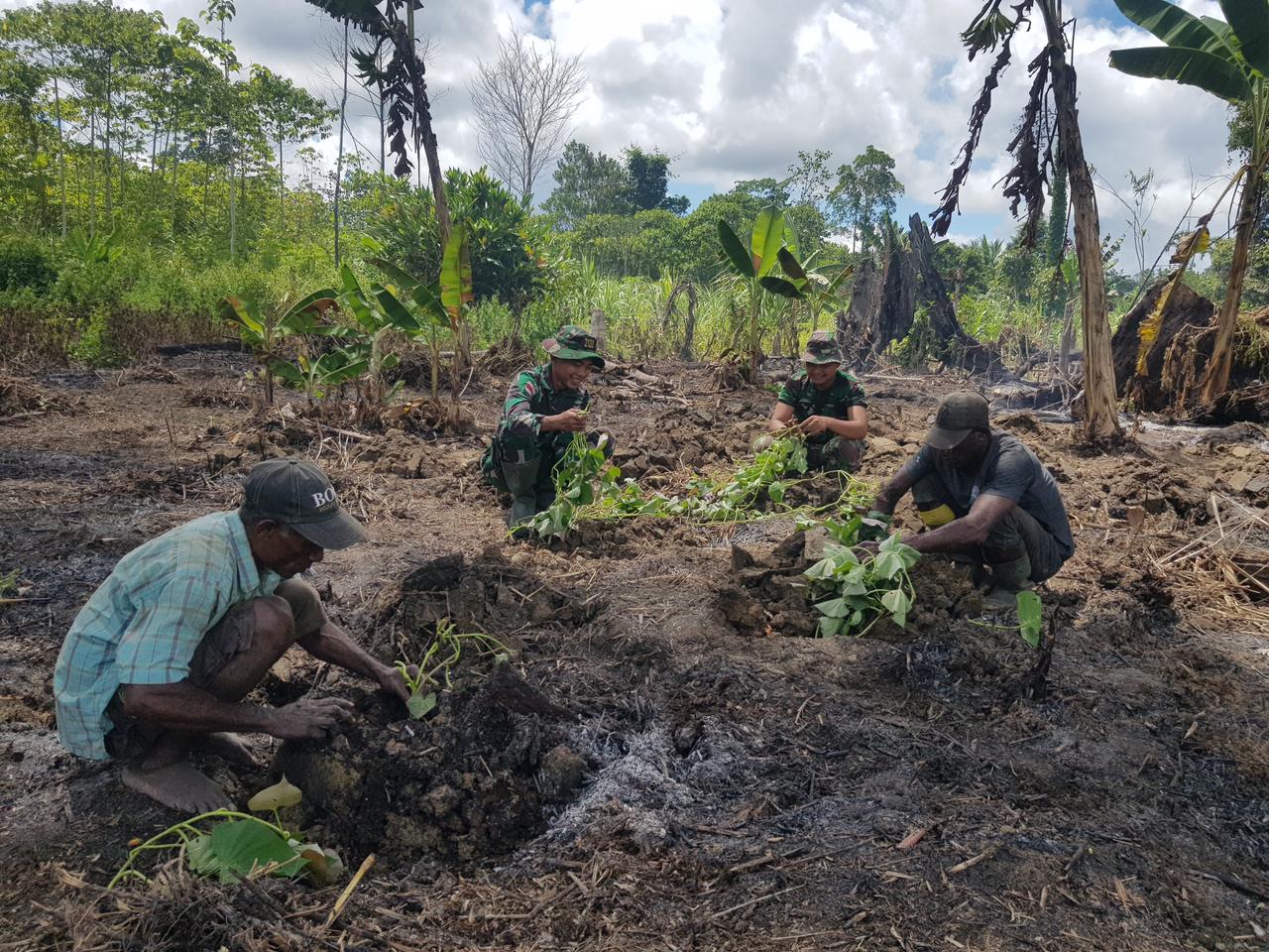 “Kami bantu warga buka lahan sekaligus turut menanam tanaman pangan guna pemenuhan pangan dan meningkatkan ekonomi warga,” tambah Dankipur.