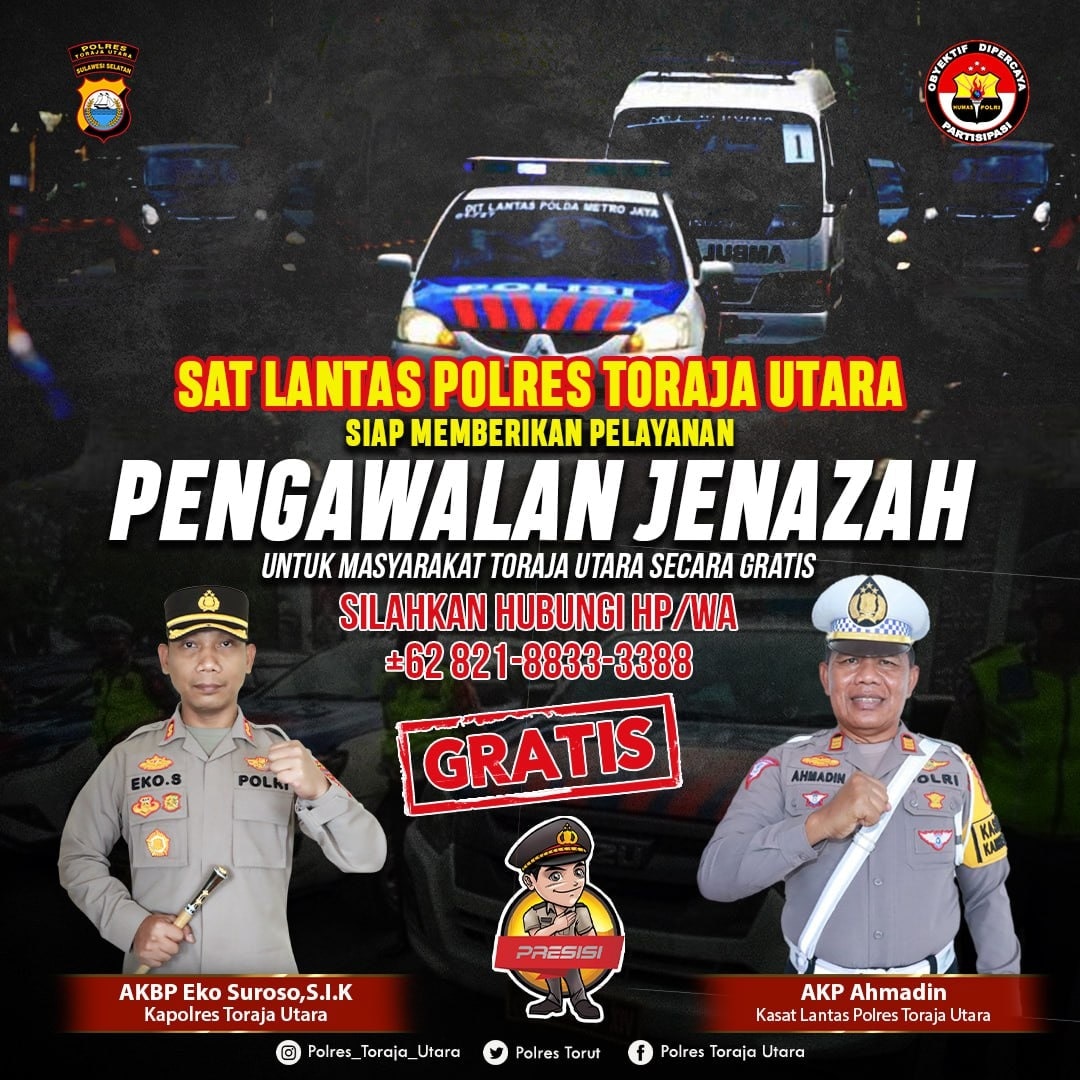 KeizalinNews.Com, Torut (Sulsel)–Dalam meningkatkan mutu pelayanan Kepolisian kepada Masyarakat, Kepolisian Resor Toraja Utara Polda Sulsel kembali menggelorakan pelayanan Pengawalan Jenazah secara gratis.