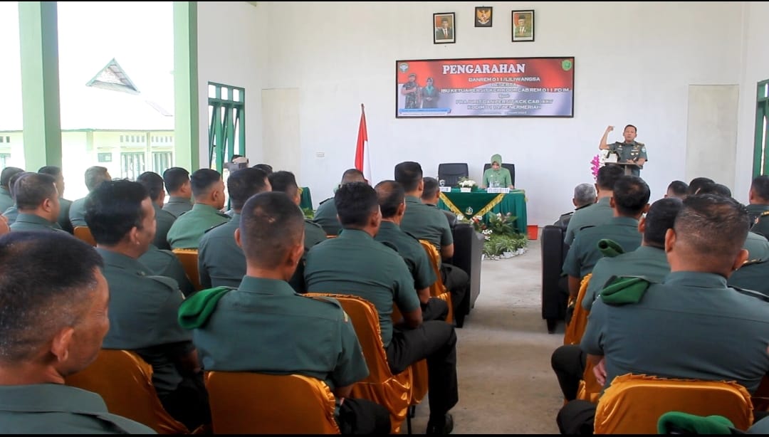 Keizalinnews.com|Redelong-Komandan Korem 011/Lilawangsa Letkol Inf Bayu Permana beri pengarahan kepada Prajurit dan Ibu Persit di Aula Makodim 0119/BM Desa Wonosobo Kecamatan Wih Pesam Kabupaten Bener Meriah. Kamis 02 Februari 2023.