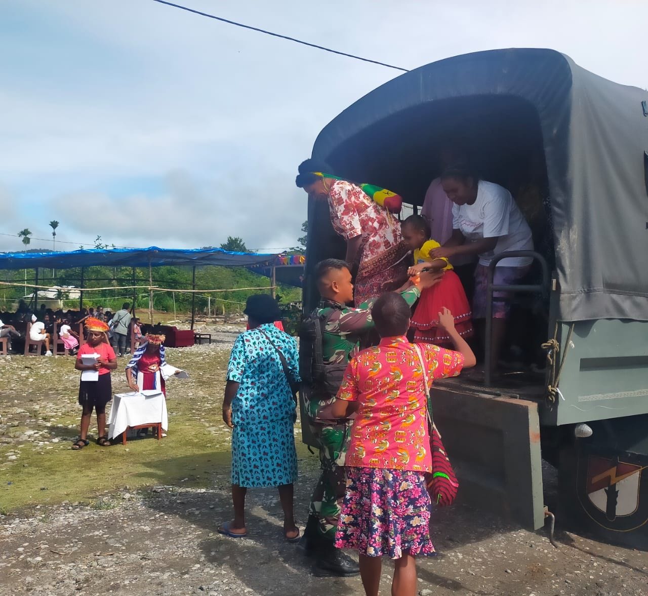 KeizalinNews Yalimo – Dalam rangka menyukseskan acara Hari Ulang Tahun masuknya Injil ke Tanah Papua, Satgas Yonif Raider 142/KJ bersama dengan beberapa personel dengan menggunakan kendaraan dinas Truk mengangkut warga selaku jemaat menuju Gereja Moria Pirip, Kampung Pirip, Distrik Elelim, Kabupaten Yalimo, Provinsi Papua Pegunungan, Minggu (05/02/2023).